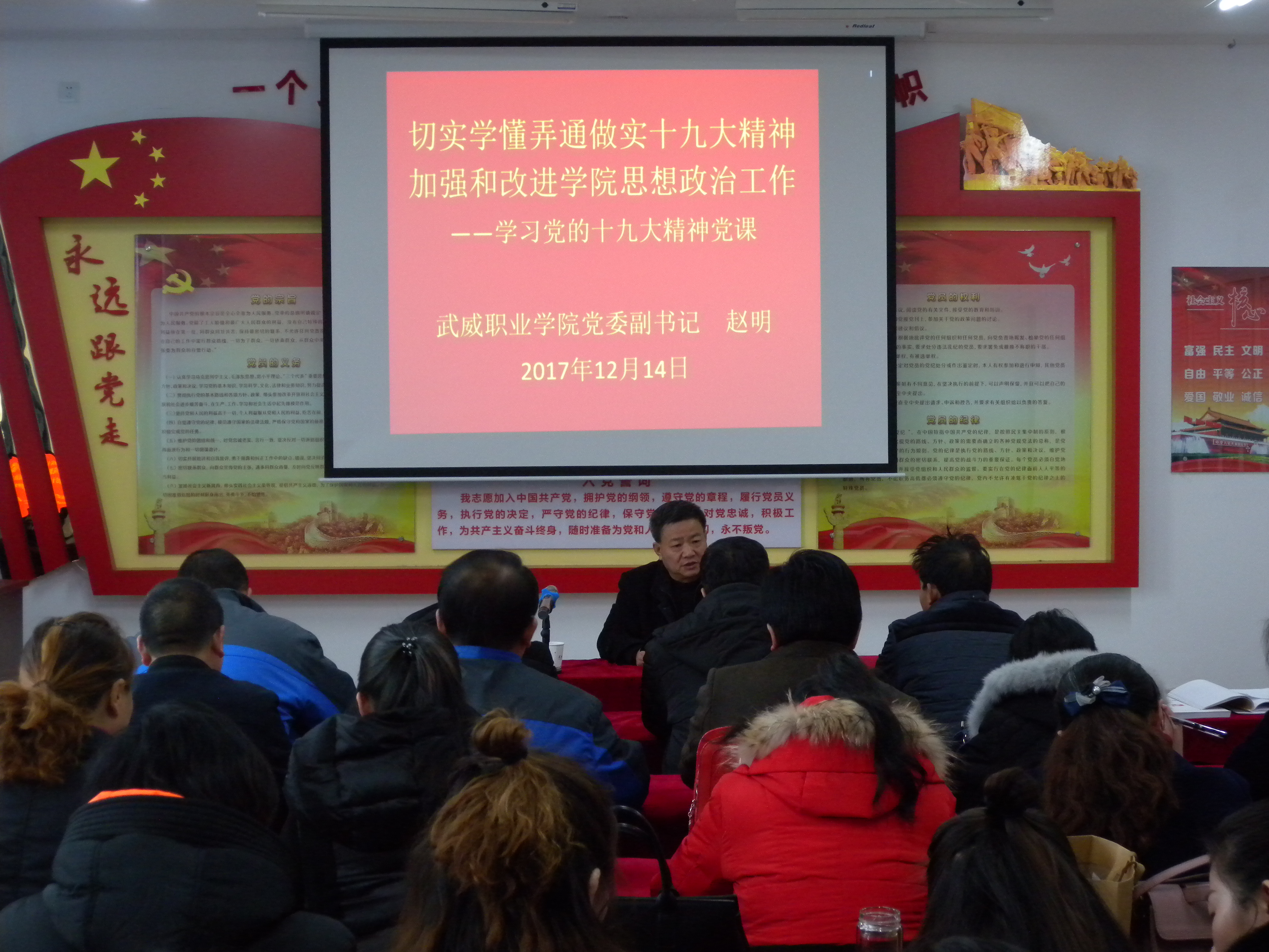 12月14日下午,人文藝術教育系黨總支邀請學院黨委副書記趙明同志到我系、馬克思主義學院講黨課,趙明同志結合自身學習十九大及習近平總書記在全國高校思想政治工作會議上的講話精神體會,做了題為《切實學懂弄通做實十九大精神? 加強大學生思想政治工作》的黨課,全體教師聆聽了黨課。