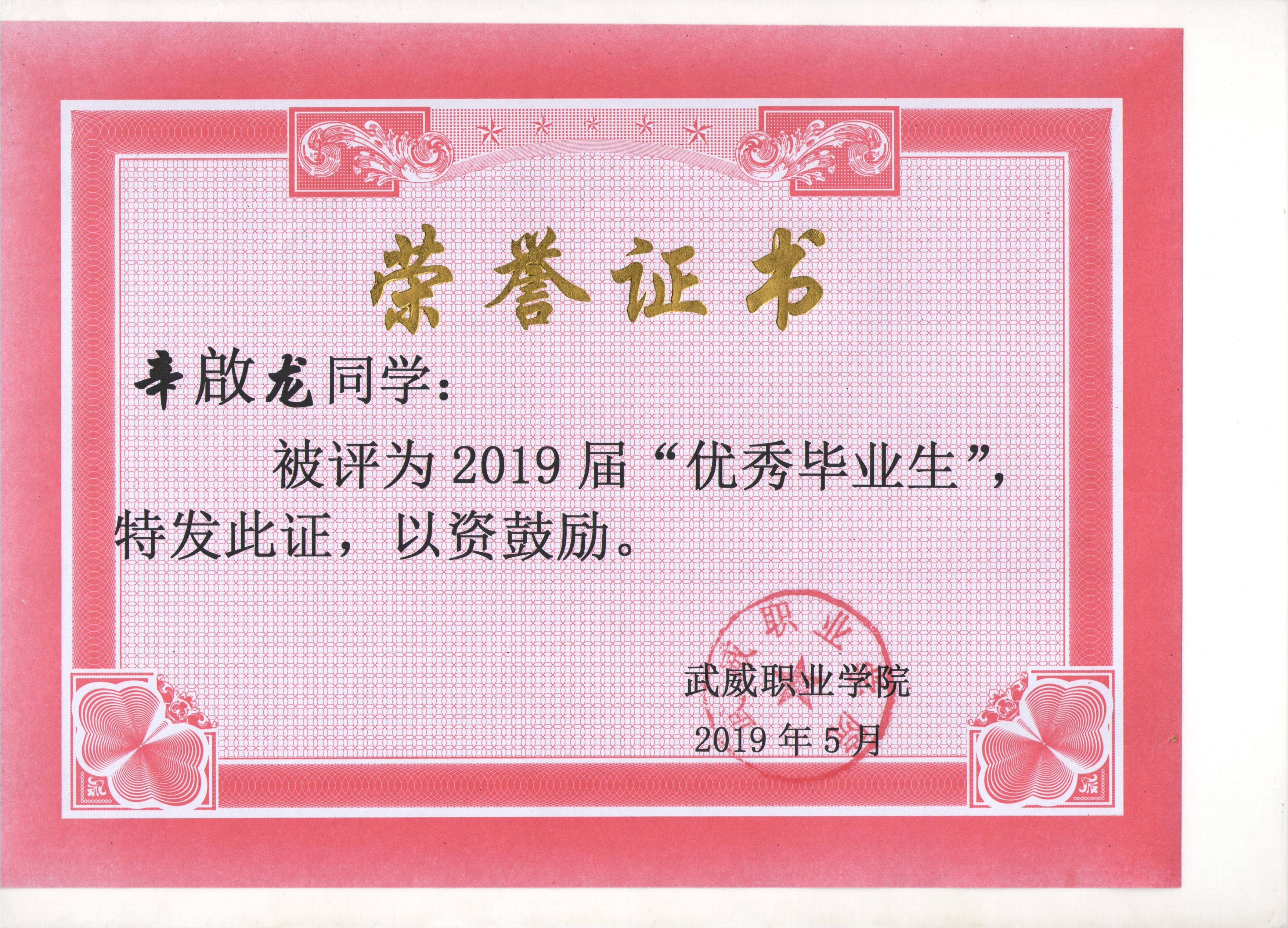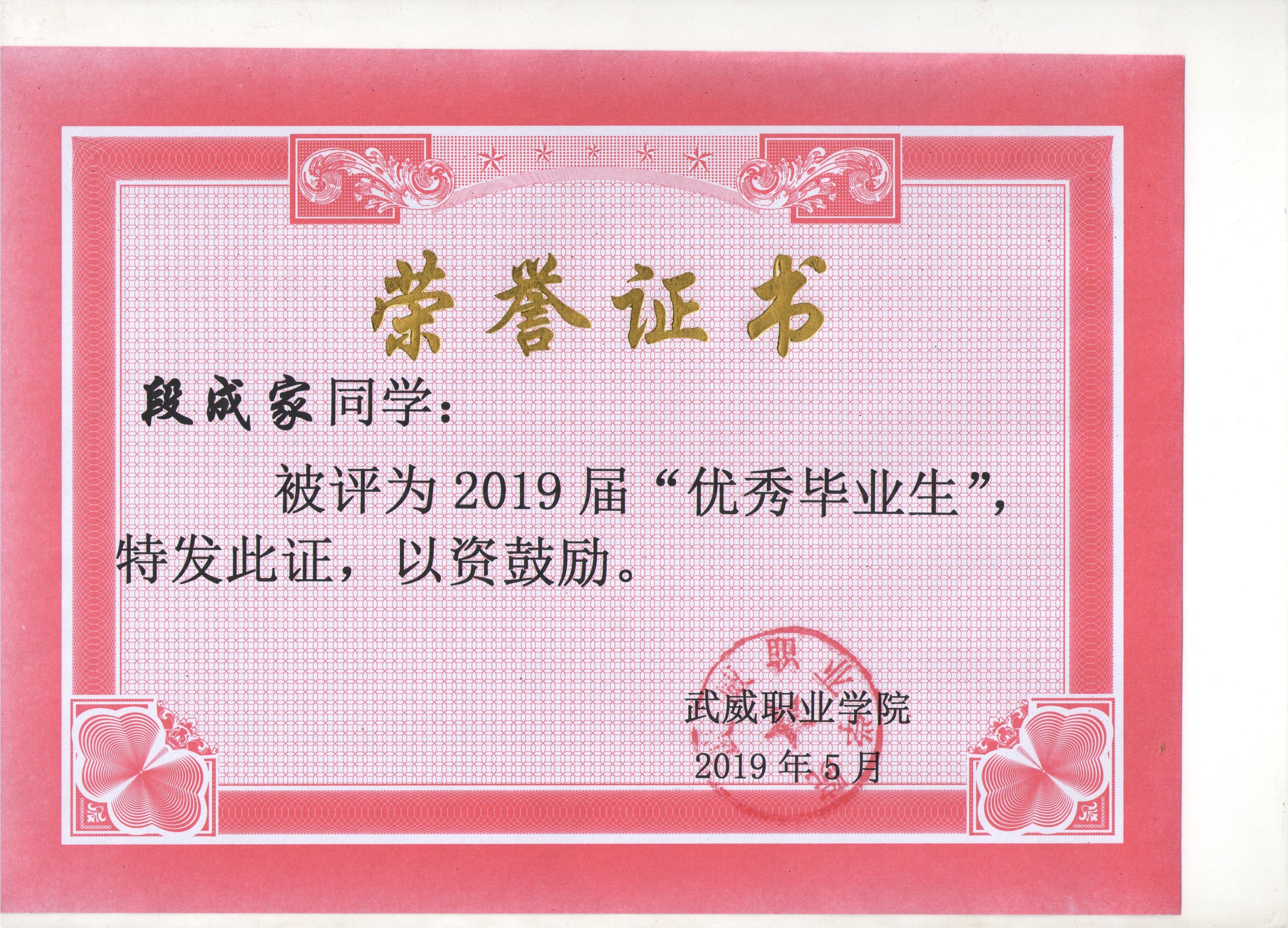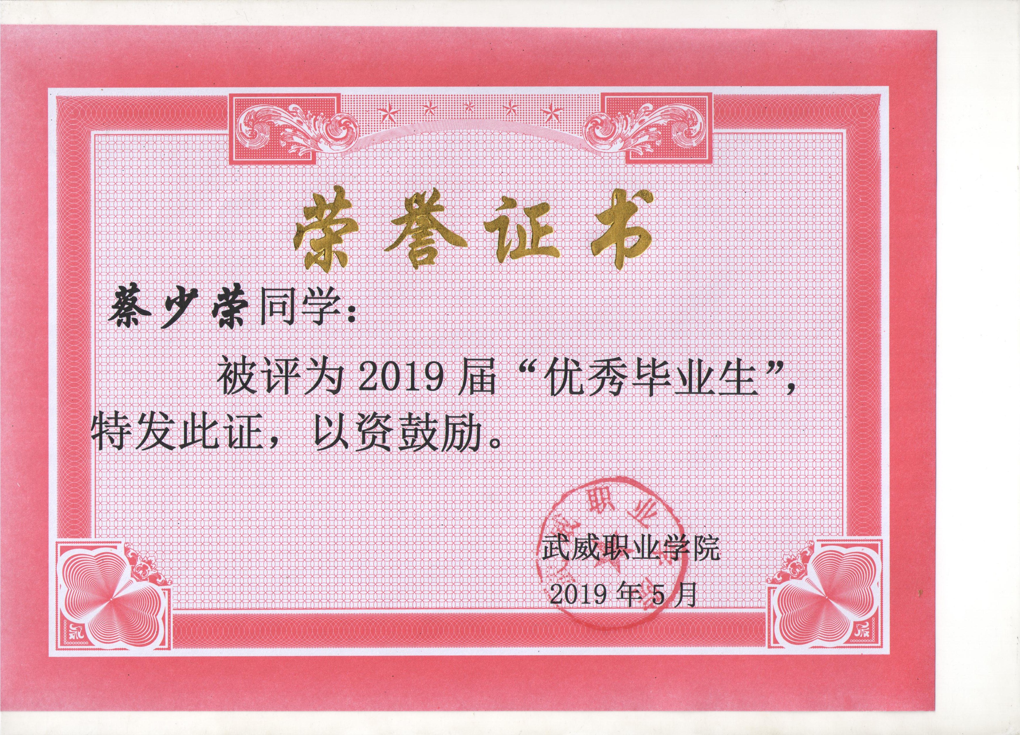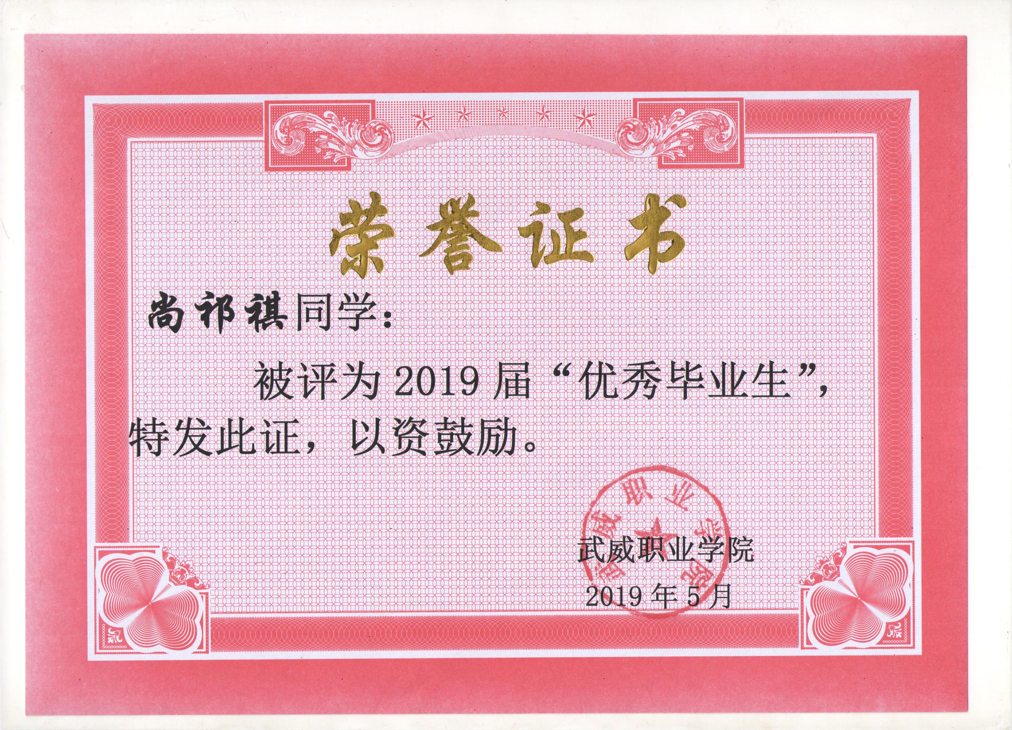 我系蔡少榮等19名同學(xué)榮獲武威職業(yè)學(xué)院2019屆“優(yōu)秀畢業(yè)生”榮譽(yù)稱(chēng)號(hào)