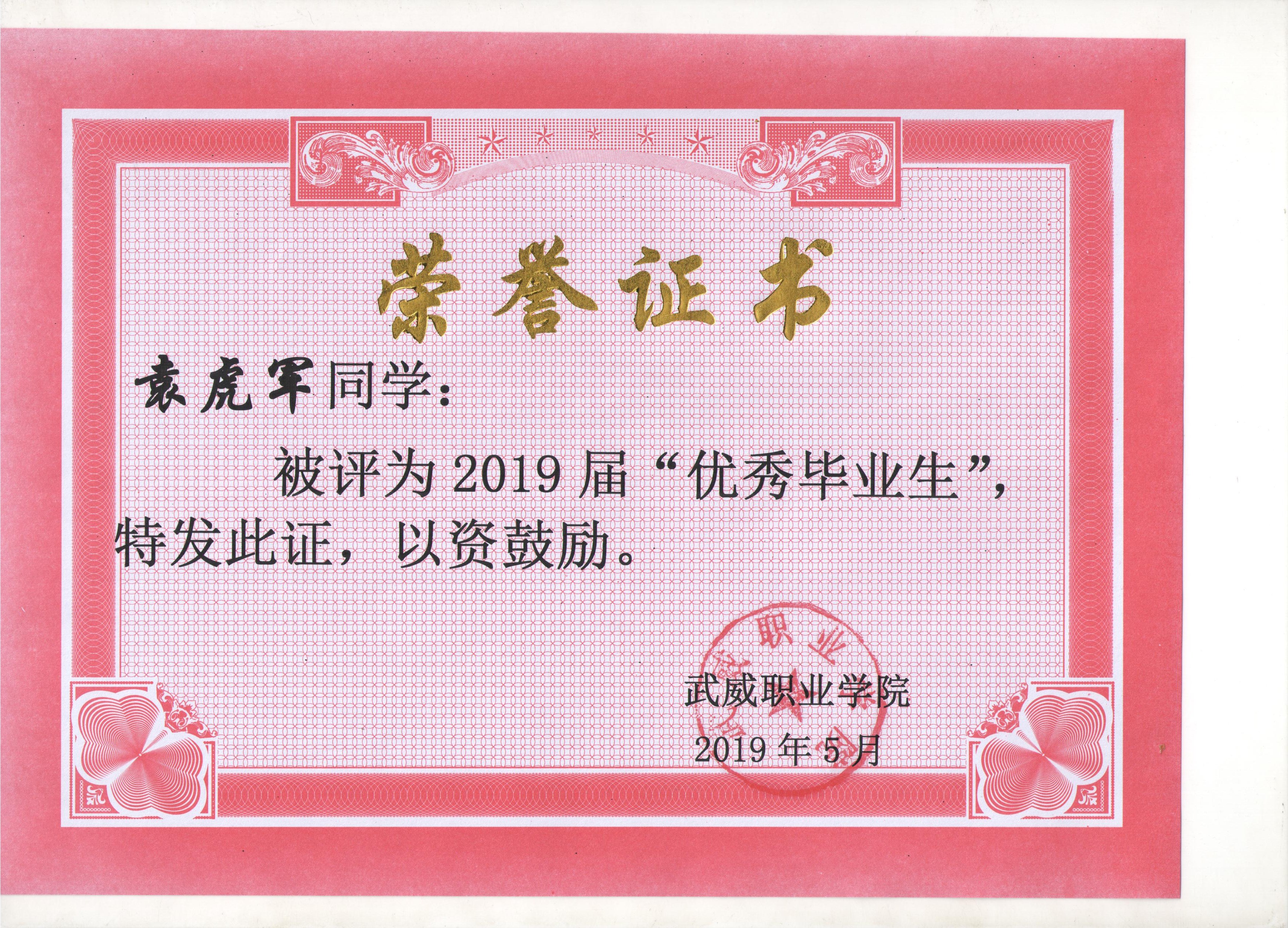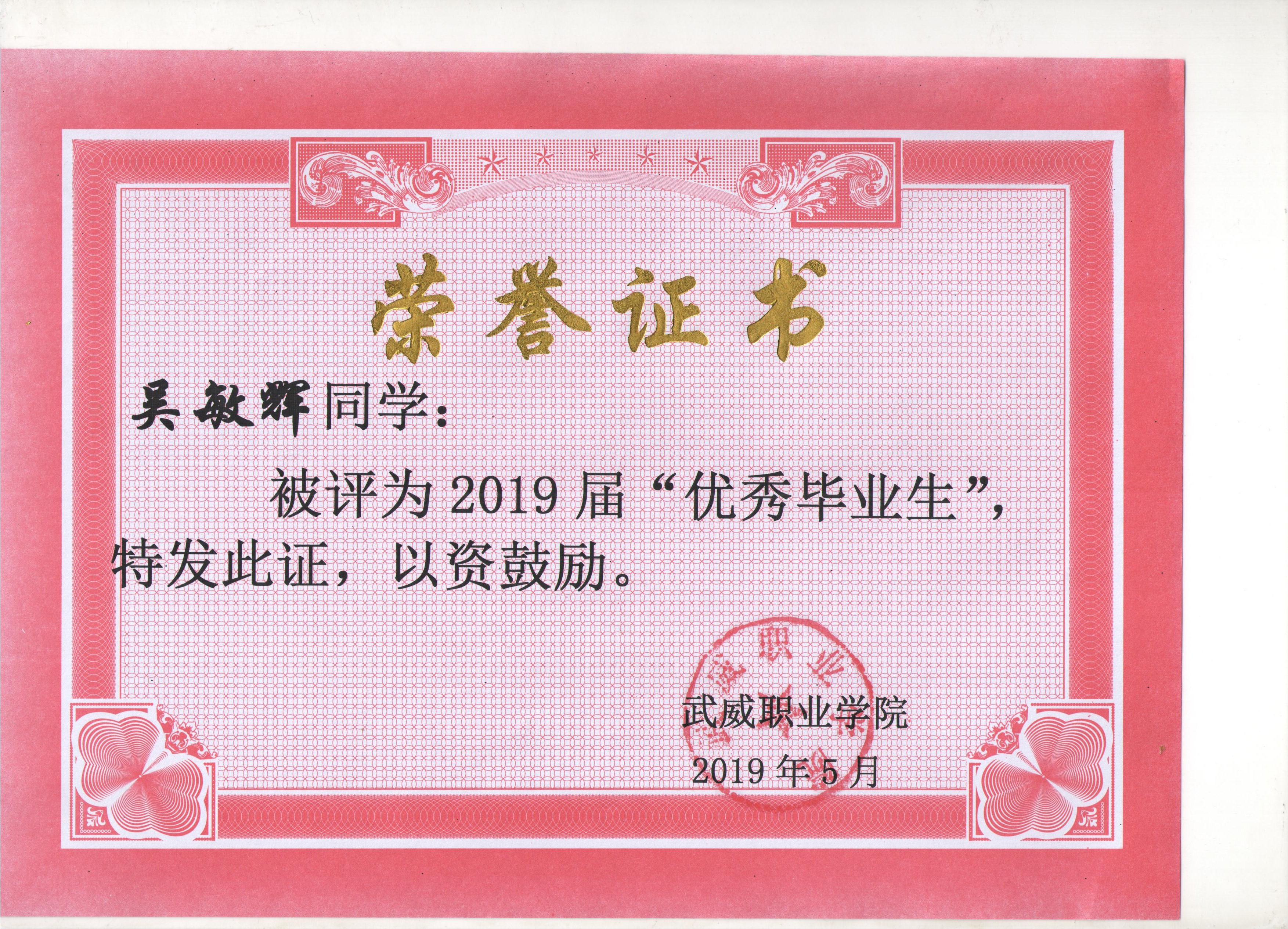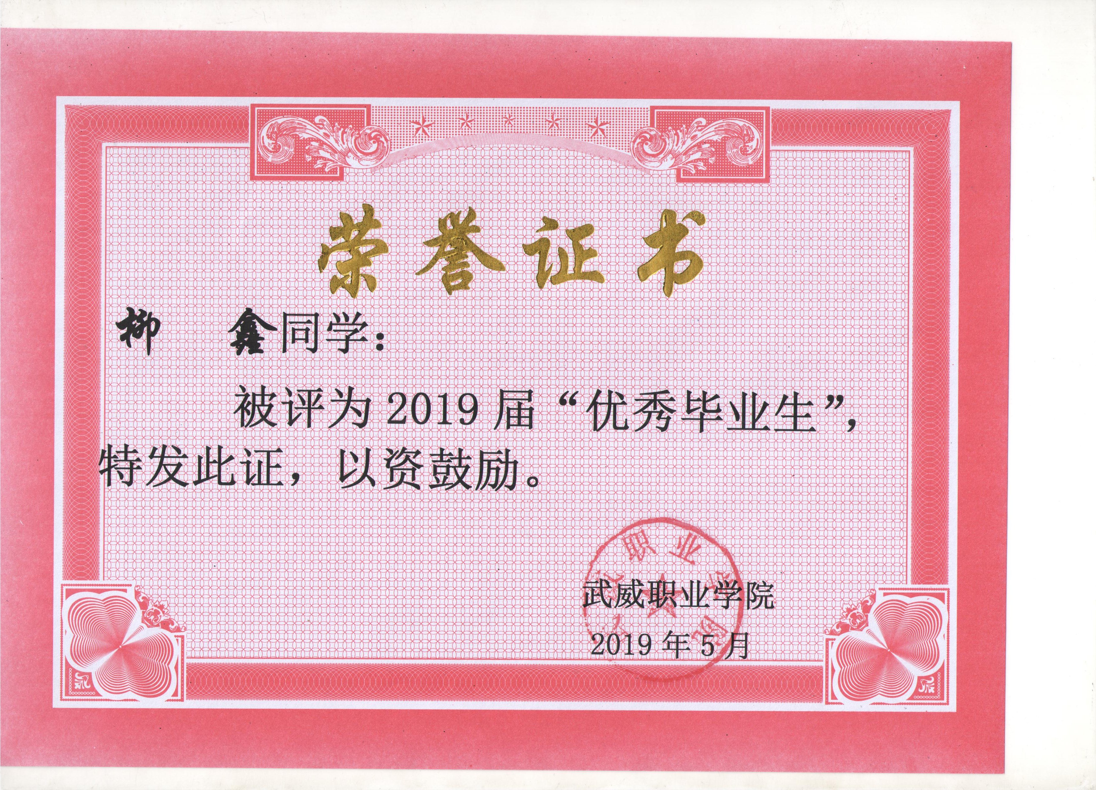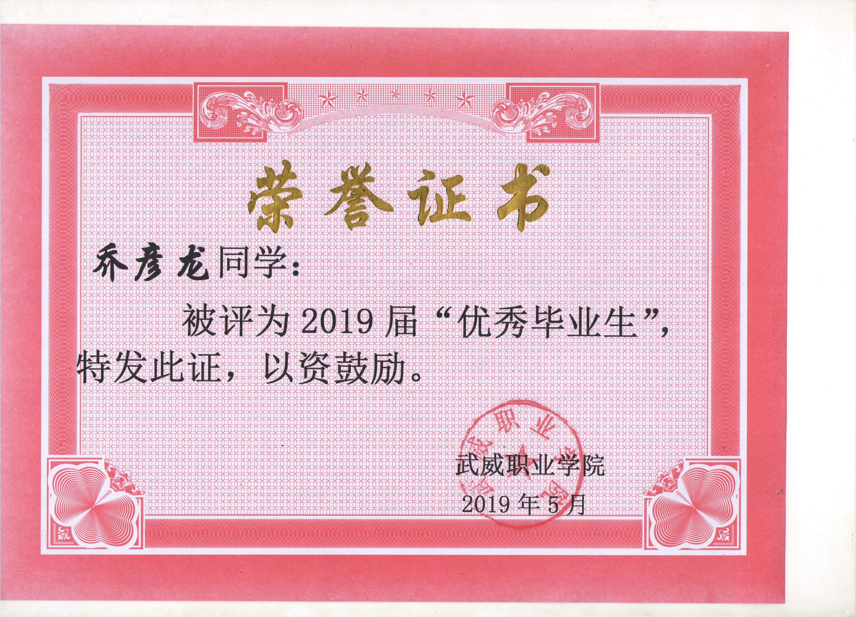 我系蔡少榮等19名同學(xué)榮獲武威職業(yè)學(xué)院2019屆“優(yōu)秀畢業(yè)生”榮譽(yù)稱(chēng)號(hào)