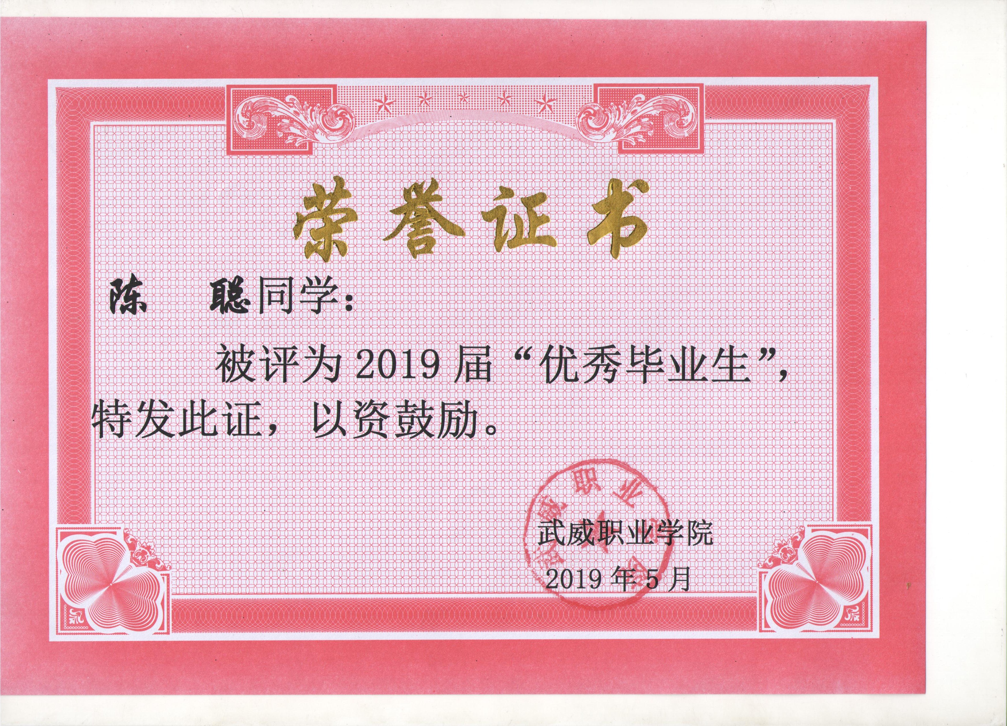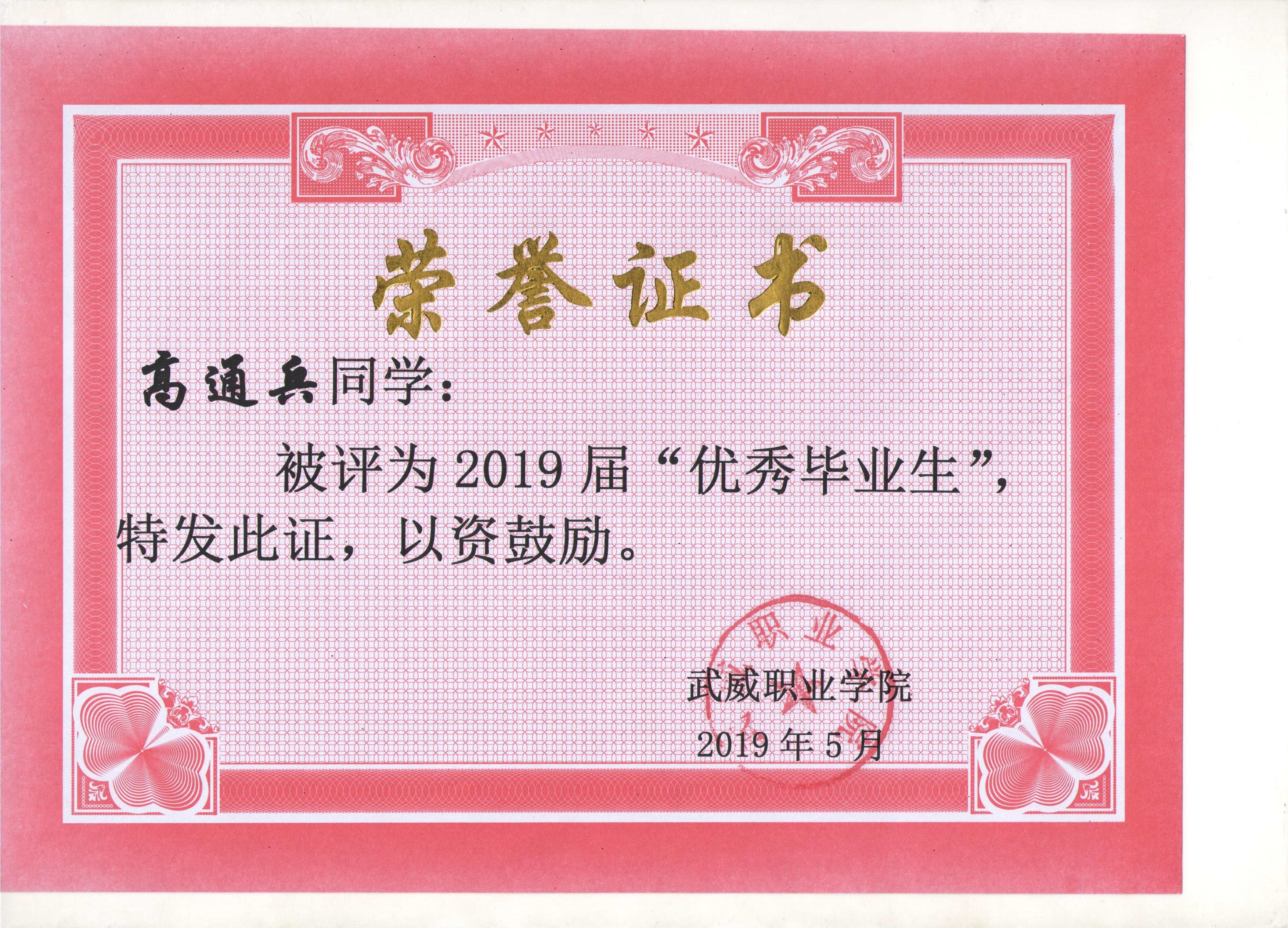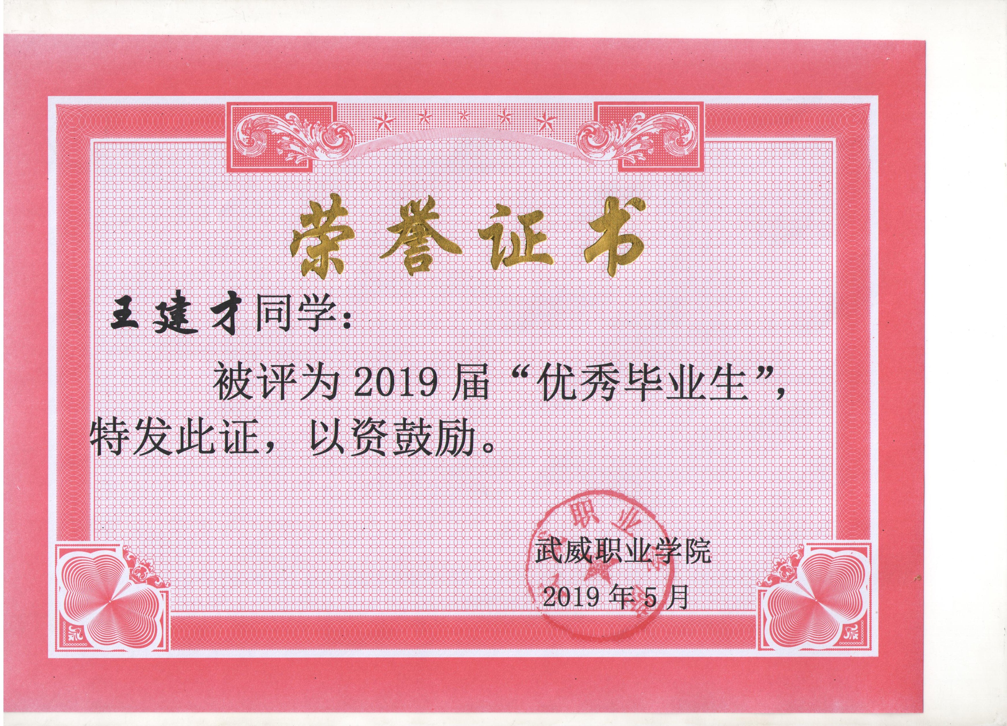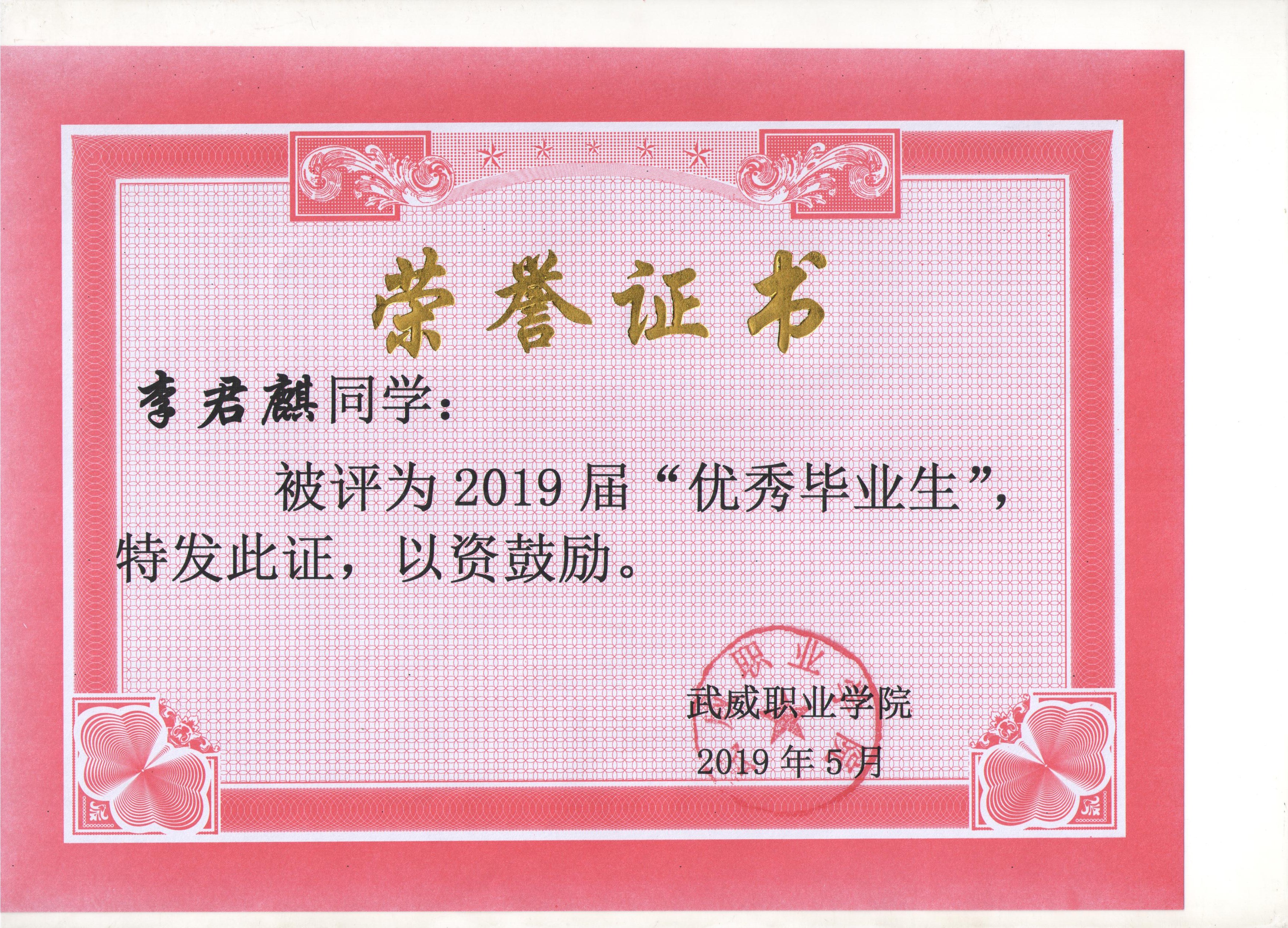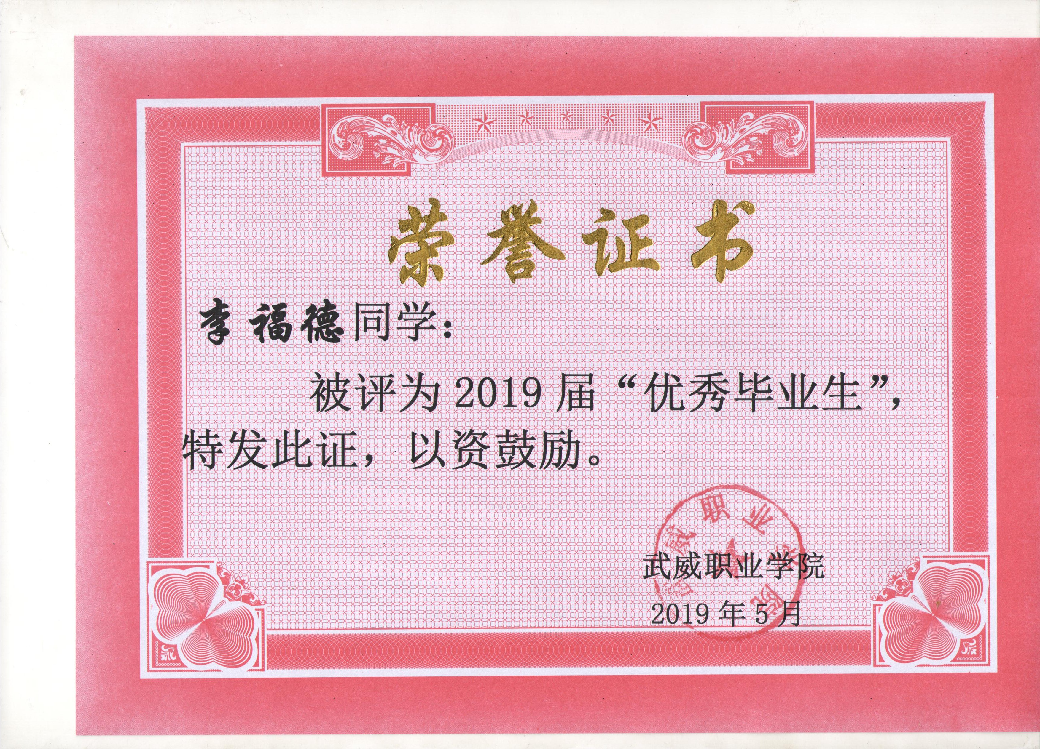 我系蔡少榮等19名同學(xué)榮獲武威職業(yè)學(xué)院2019屆“優(yōu)秀畢業(yè)生”榮譽(yù)稱(chēng)號(hào)
