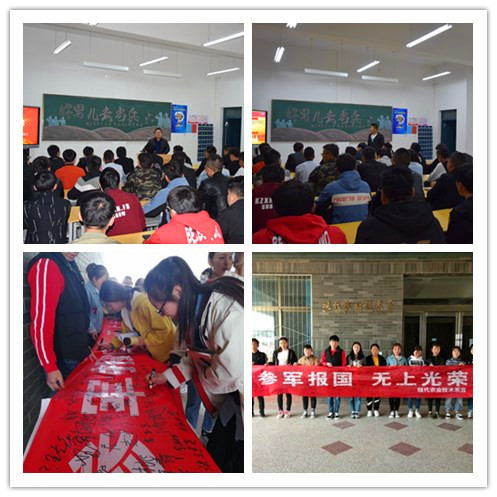 首先蔡海老師向同學(xué)們細(xì)致地講解了今年的征兵條件、報(bào)名方法及相關(guān)優(yōu)待政策,深入宣傳依法服兵役的積極意義,鼓勵適齡青年積極報(bào)名應(yīng)征,報(bào)效祖國。同時(shí)邀請2017級設(shè)施農(nóng)業(yè)裝備大專班趙文文同學(xué)做了個人事跡匯報(bào)。該生曾在陸軍某部服役,現(xiàn)光榮退伍,回校就讀。交流中,他鼓勵同學(xué)們要敢于有夢、敢于追夢、敢于圓夢,讓青春在軍營的歷練中、在為祖國的奉獻(xiàn)中閃光。他還生動的講述了部隊(duì)的生活和訓(xùn)練情況,這段經(jīng)歷使他收獲了遠(yuǎn)大的理想信念,培養(yǎng)了良好的行為習(xí)慣,練就了強(qiáng)健的身體,這些將會讓他終身受益?;顒?/font>最后進(jìn)行了“參軍報(bào)國,無上光榮”主題簽名儀式。