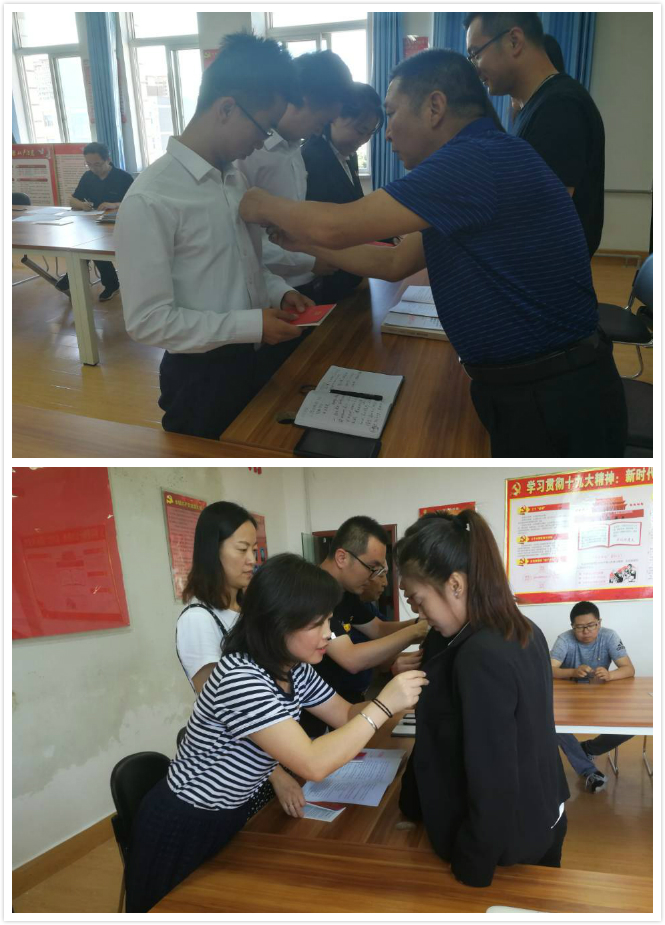 在唐宗舜同志的帶領下,4名預備黨員和全體黨員右手握拳舉過肩頭,面向鮮紅的黨旗,進行了莊嚴宣誓。宣誓結(jié)束后,參加宣誓儀式的正式黨員為預備黨員佩戴了黨徽、贈送了《黨章》。