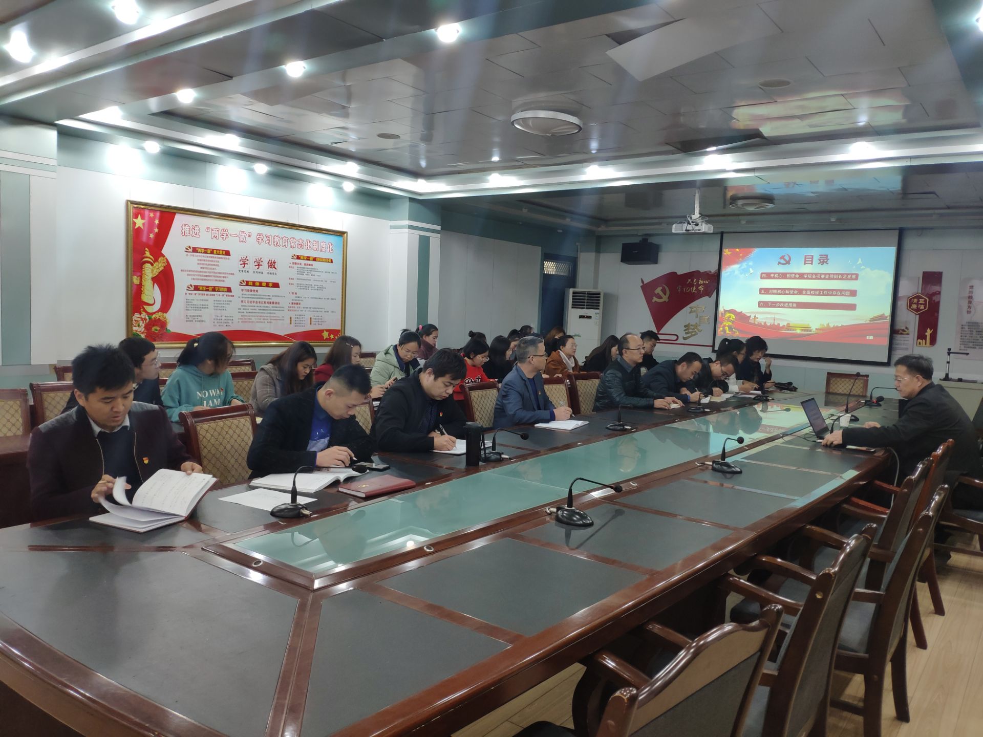 張開禮從“深刻認識’不忘初心、牢記使命’主題教育的重大意義”、“強化理論武裝,進一步深入學(xué)習(xí)貫徹習(xí)近平新時代中國特色社會主義”、“以習(xí)近平新時代中國特色社會主義思想為指導(dǎo),努力辦好人民滿意的高職教育”“守初心、擔(dān)使命,學(xué)院各項事業(yè)得到長促發(fā)展”、“對照初心和使命,全面檢視工作中存在的問題”等五個方面,為全體與會黨員進行了詳細的輔導(dǎo)講解。