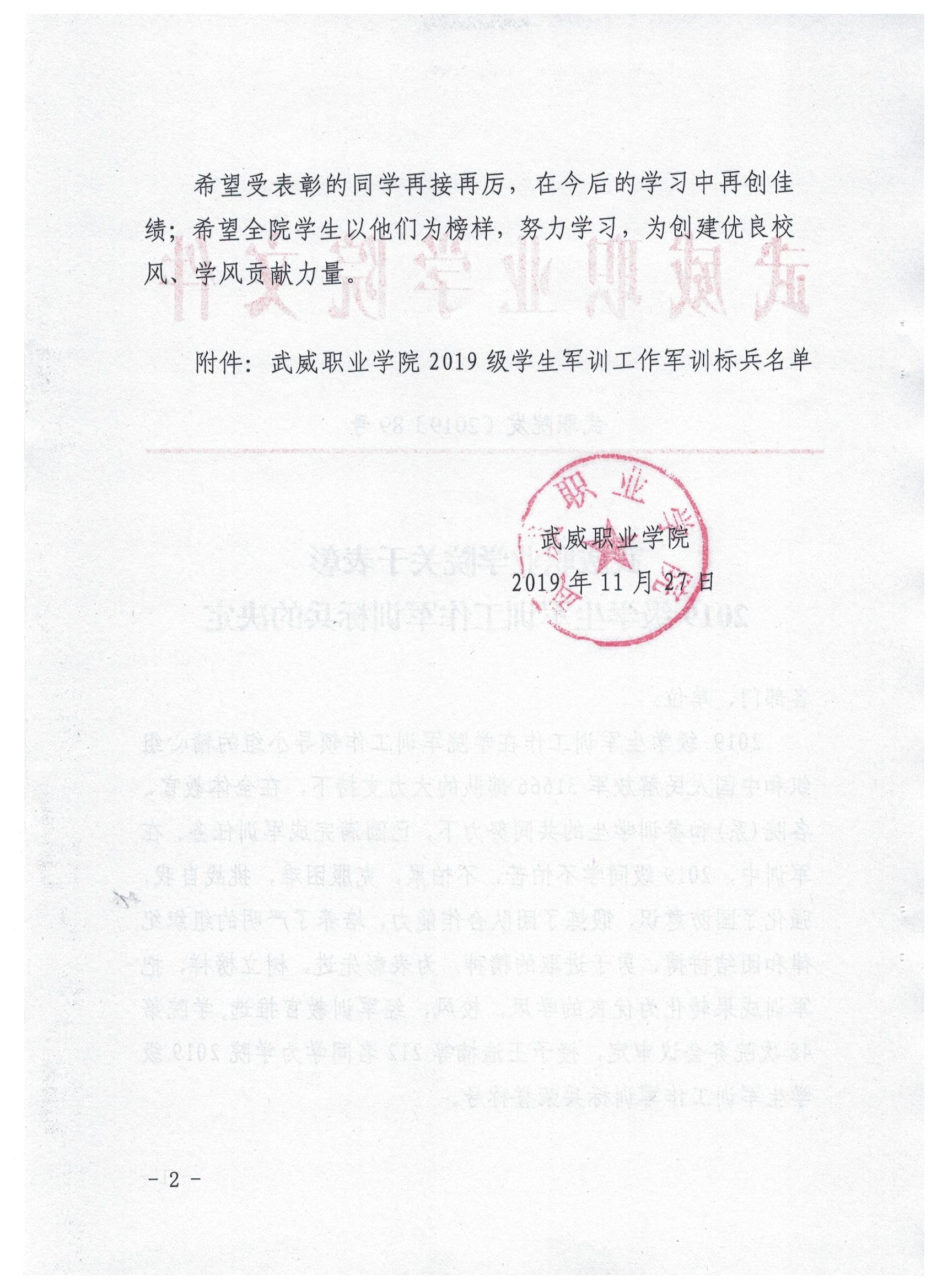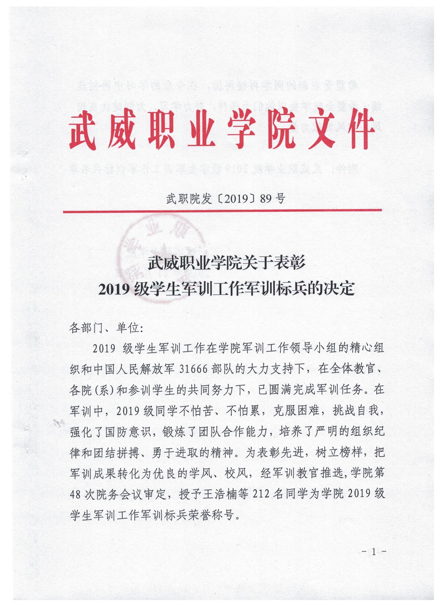 武威職業(yè)學(xué)院關(guān)于表彰2019級學(xué)生軍訓(xùn)工作先進(jìn)集體、先進(jìn)個(gè)人的決定