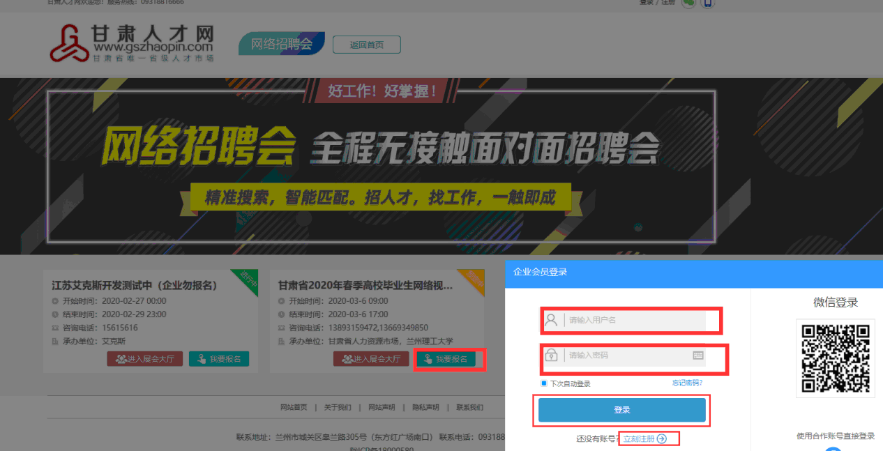 1.登錄甘肅人才網(wǎng)(www.gszhaopin.com),點擊菜單欄“招聘會”—“網(wǎng)絡(luò)招聘會”進(jìn)入二級頁面菜單,進(jìn)入網(wǎng)絡(luò)招聘會列表—選擇“武威職業(yè)學(xué)院2020屆醫(yī)藥衛(wèi)生類畢業(yè)生網(wǎng)絡(luò)視頻雙選會”點擊“我要報名”按鈕,登錄企業(yè)后臺(無賬號點擊“立即注冊”,資質(zhì)通過審核后再報名),待定審核。
