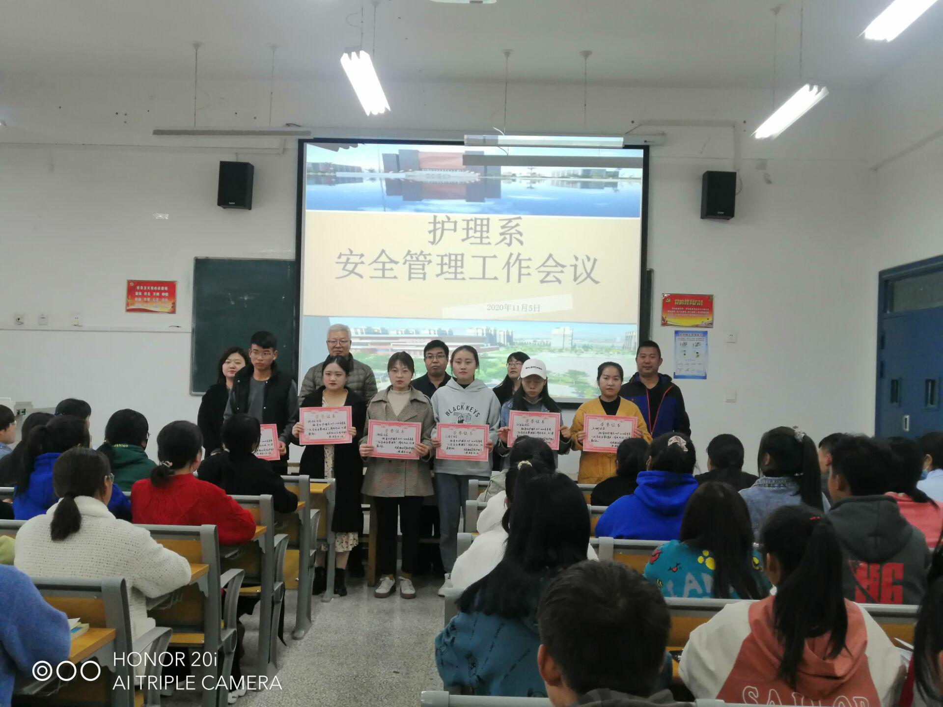 會(huì)上,陳鳳平宣讀了《護(hù)理系關(guān)于表彰2019-2020學(xué)年度學(xué)生優(yōu)秀安全管理員的決定》,護(hù)理系書(shū)記張建輝為獲表彰學(xué)生頒發(fā)榮譽(yù)證書(shū)。張學(xué)軍就近期我系存在的安全隱患問(wèn)題作了詳細(xì)的說(shuō)明。張建輝傳達(dá)了學(xué)院召開(kāi)的疫情常態(tài)化防控工作會(huì)議內(nèi)容及相關(guān)文件精神,他指出,全系要進(jìn)一步加強(qiáng)安全隱患排查,尤其是實(shí)驗(yàn)室安全,切實(shí)將安全各項(xiàng)工作措施落到實(shí)處,預(yù)防安全事故的發(fā)生。他強(qiáng)調(diào),全系師生要進(jìn)一步加強(qiáng)學(xué)生身體健康監(jiān)測(cè),尤其是每天的晨午檢、日?qǐng)?bào)告、零報(bào)告,切實(shí)將疫情防控各項(xiàng)工作措施落到實(shí)處;倡導(dǎo)文明就餐,增強(qiáng)節(jié)約意識(shí),實(shí)施“光盤行動(dòng)”,杜絕浪費(fèi)發(fā)生; 持續(xù)做好宿舍、教室及環(huán)境衛(wèi)生掃除,營(yíng)造良好的學(xué)習(xí)、生活和工作環(huán)境;安全是所有工作的基礎(chǔ)與保障,全體安全員要齊心協(xié)力、攜手努力,除隱患、防火險(xiǎn)、保安全、促和諧,為建設(shè)美好校園戮力奮進(jìn)。