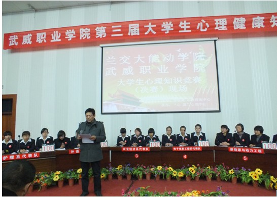 11月12日晚,由院學(xué)生處心理健康教育中心、院團委主辦,心翼心理學(xué)社承辦的第三屆大學(xué)生心理健康知識競賽決賽在學(xué)院東階梯教室舉行。副院長王永緒同志應(yīng)邀參加活動并致辭,指明本次活動的目的和必要性,并預(yù)祝活動圓滿成功。參加本次活動的還有學(xué)生處、能動學(xué)院辦公室、院團委負責人以及各系書記、輔導(dǎo)員。