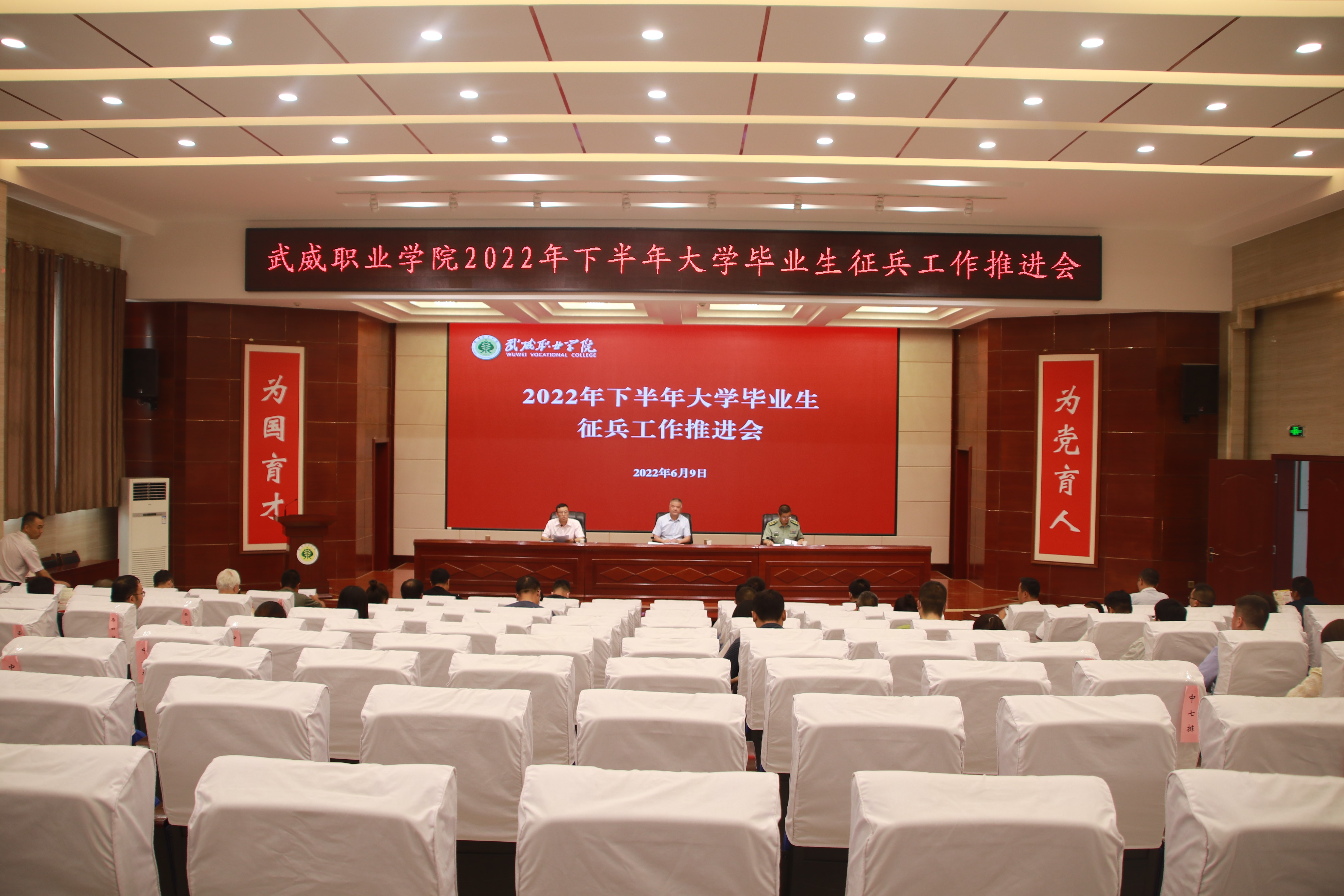 6月9日下午,學(xué)校2022年下半年大學(xué)畢業(yè)生征兵工作推進會在菁英廳召開,學(xué)校黨委委員、副校長王守云,涼州區(qū)人武部中校副部長何志強出席會議。