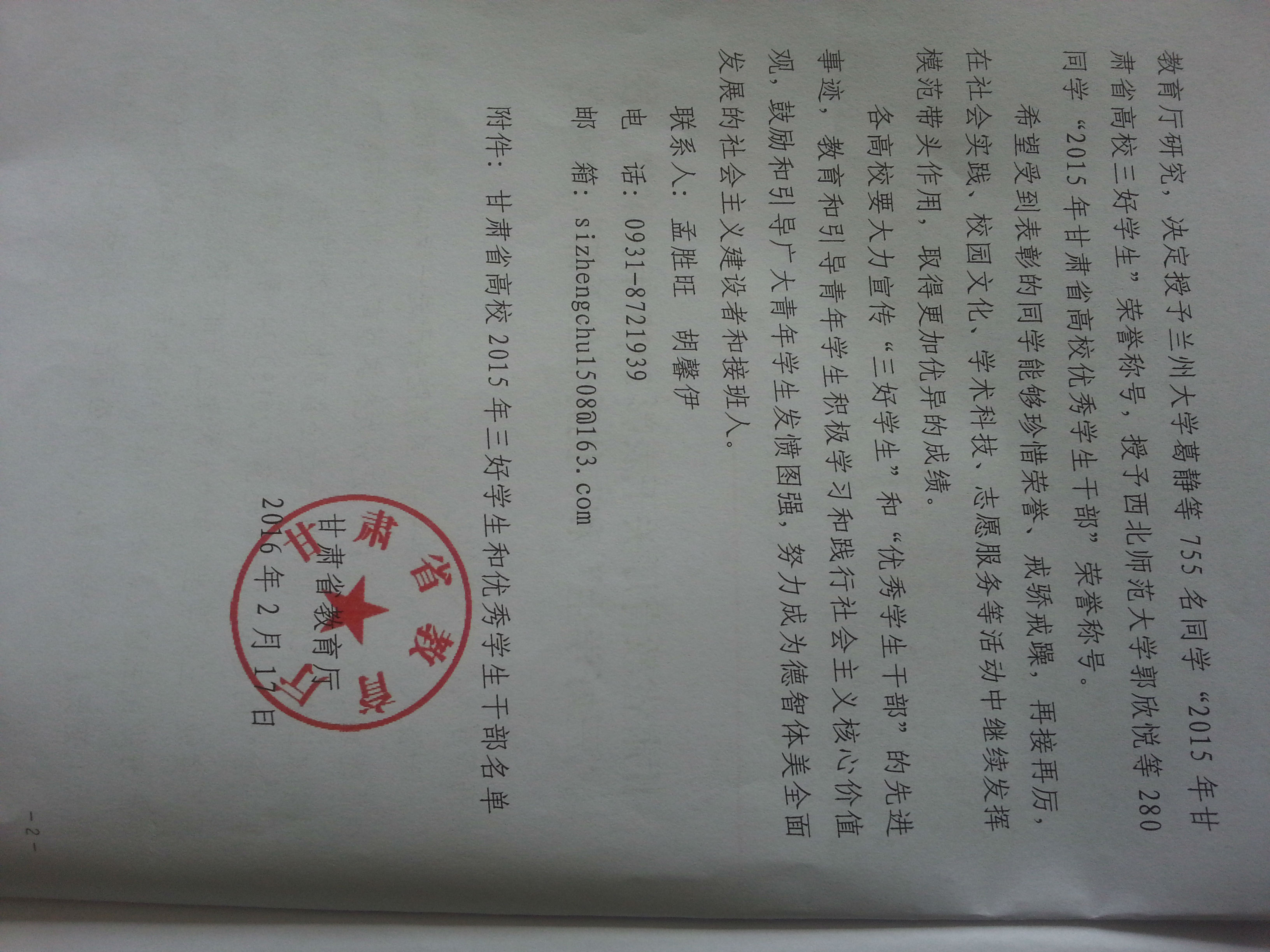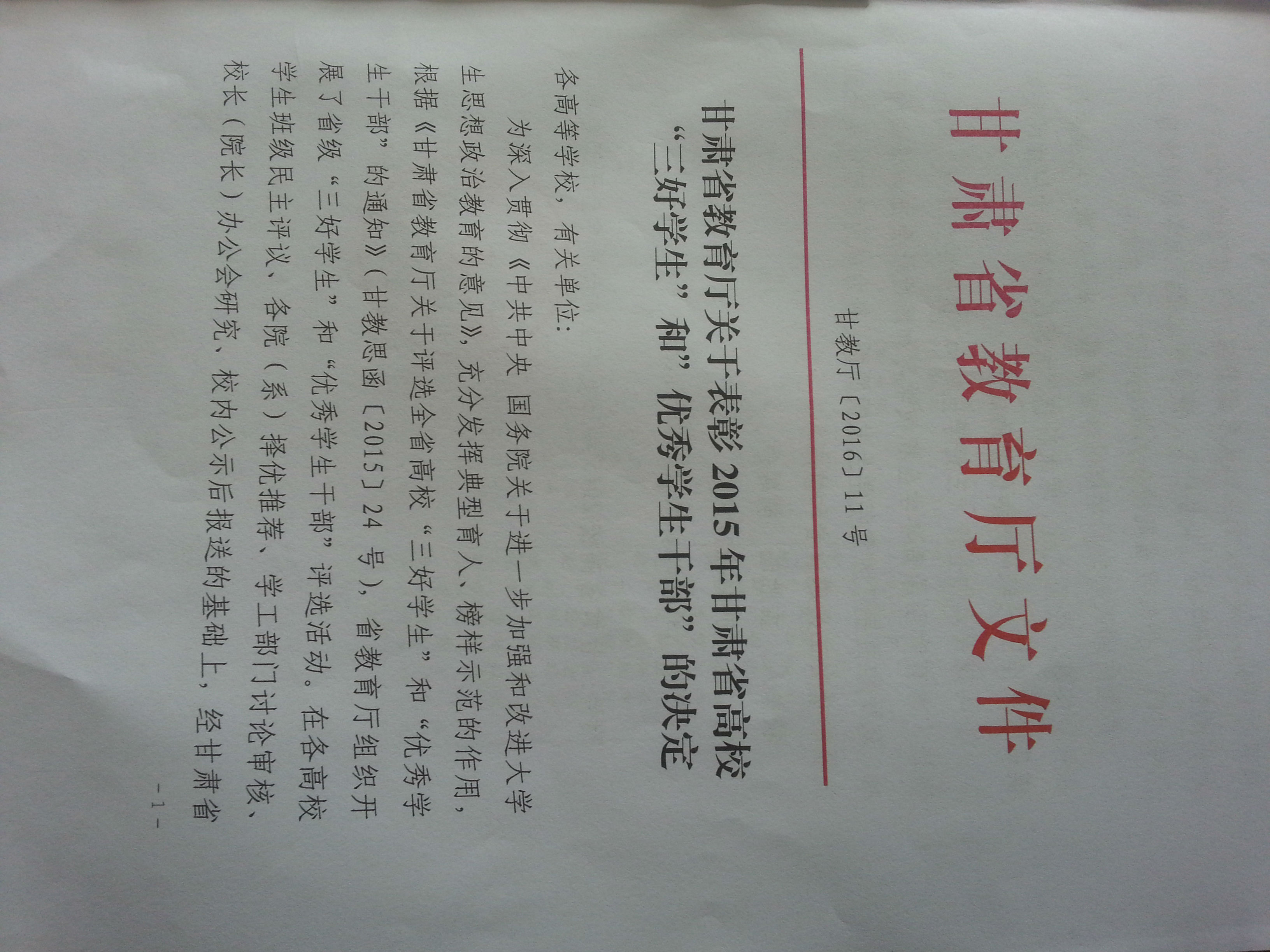 甘肅省教育廳關(guān)于表彰2015年甘肅省高?!叭脤W(xué)生”和“優(yōu)秀學(xué)生干部”的決定
