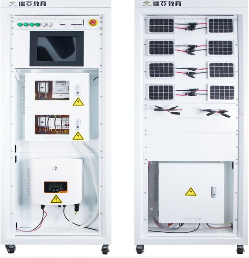 光伏電站智能運維實訓平臺主要有光伏組件模塊、光伏陣列模塊、匯流箱裝調與檢測模塊、逆變器裝調與檢測模塊、并網(wǎng)箱裝調與檢測模塊、運維采集模塊組成。