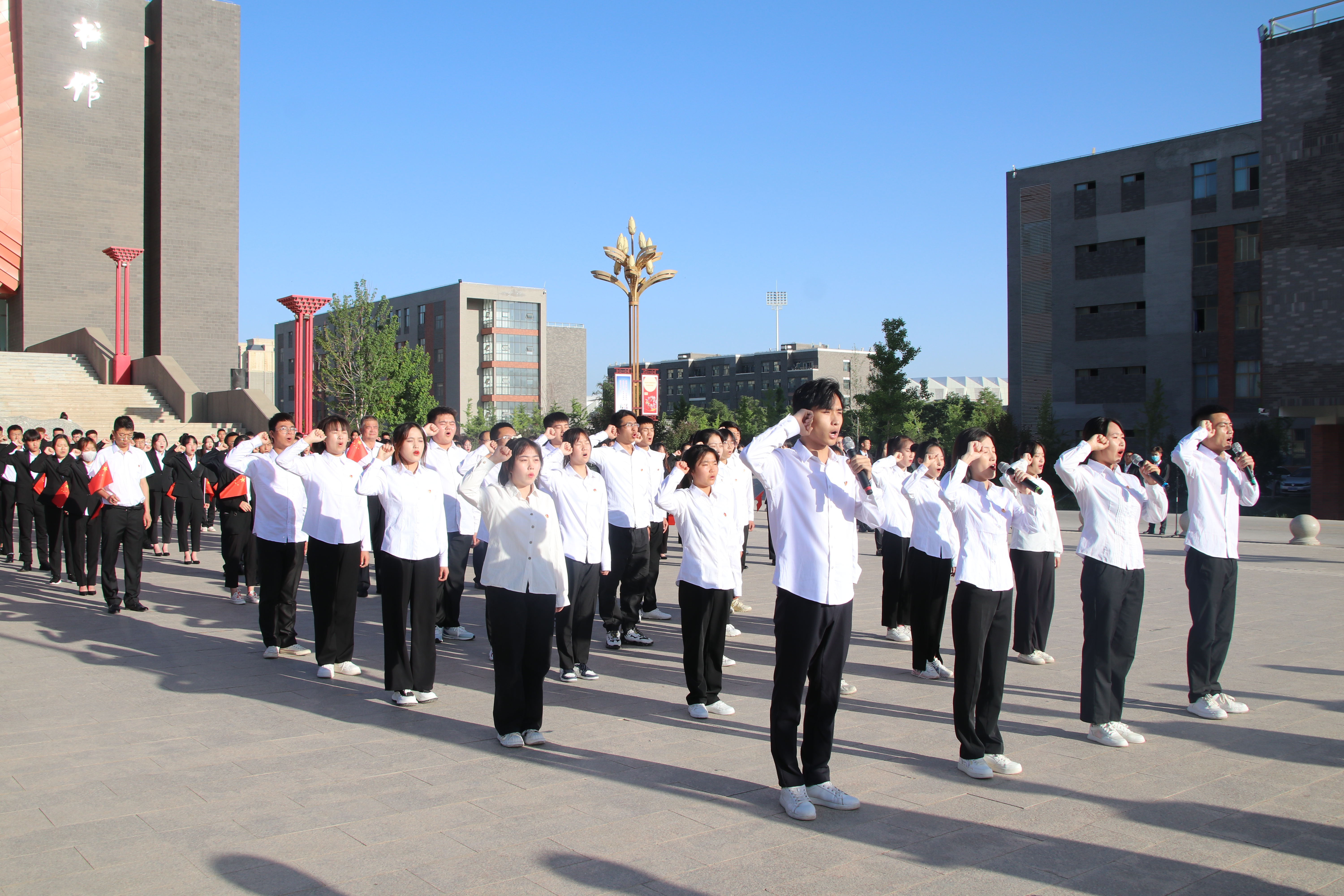 迎著朝陽(yáng),五星紅旗在國(guó)旗護(hù)衛(wèi)隊(duì)的護(hù)送下緩緩入場(chǎng),昂昂國(guó)歌奏響,國(guó)旗迎風(fēng)飄揚(yáng),全場(chǎng)師生齊唱國(guó)歌。學(xué)生代表在國(guó)旗下致獻(xiàn)詞,對(duì)黨許下青春的誓言,獻(xiàn)詞之后舉行了嚴(yán)肅莊重的重溫入團(tuán)誓詞儀式,增強(qiáng)了共青團(tuán)員的組織光榮感和歸屬感,激發(fā)了團(tuán)員青年的使命感和責(zé)任感。最后,全體團(tuán)員青年齊唱《共青團(tuán)團(tuán)歌》,用響亮的歌聲表達(dá)建團(tuán)百年再出發(fā)的祝福,現(xiàn)場(chǎng)愛(ài)國(guó)熱情持續(xù)高漲。