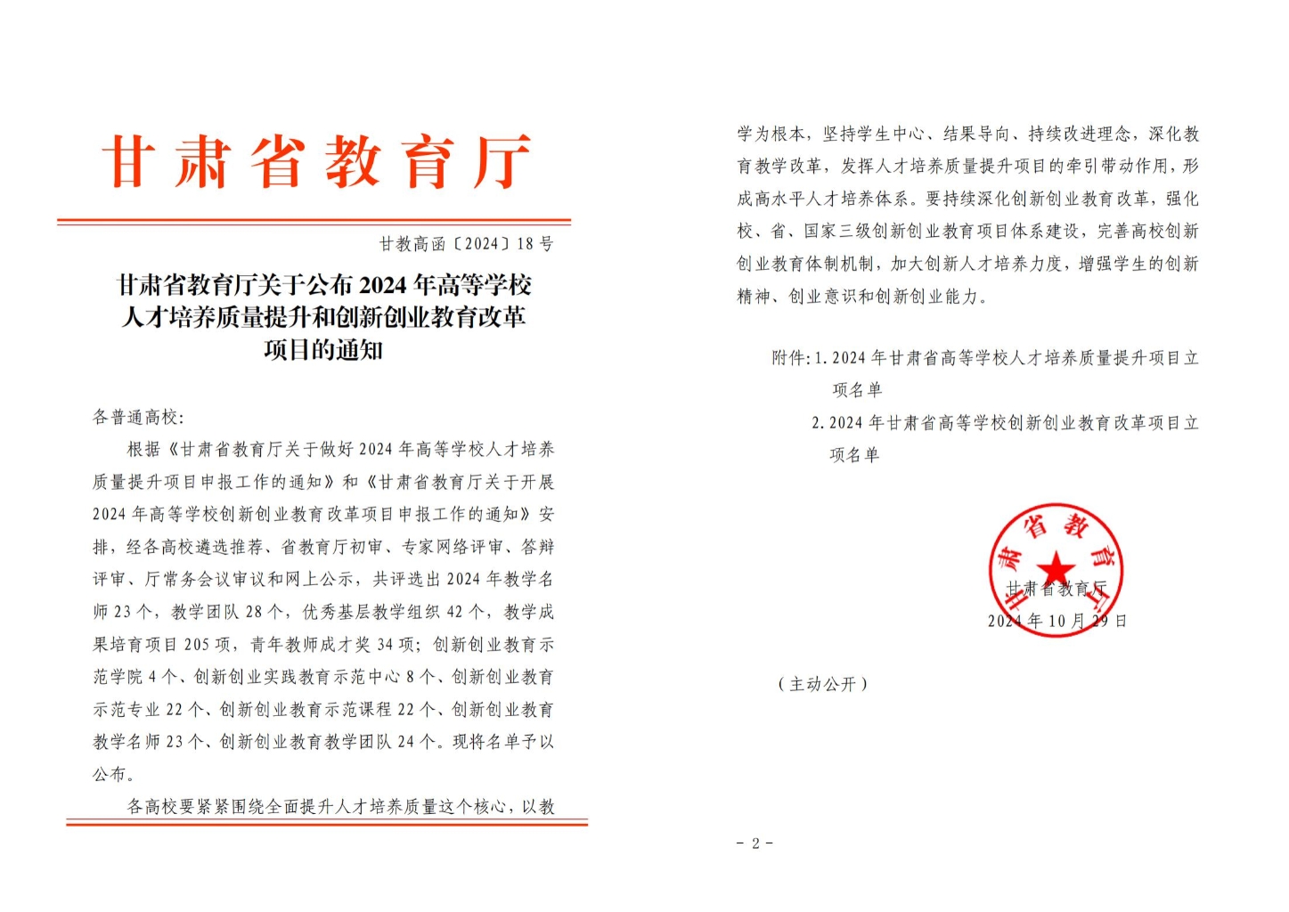 創(chuàng)新創(chuàng)業(yè)教育改革項目是為深入貫徹落實《國務(wù)院辦公廳關(guān)于進(jìn)一步支持大學(xué)生創(chuàng)新創(chuàng)業(yè)的指導(dǎo)意見》(國辦發(fā)〔2021〕35 號)、《甘肅省教育廳等十三部門印發(fā)〈甘肅省關(guān)于進(jìn)一步支持大學(xué)生創(chuàng)新創(chuàng)業(yè)的若干措施〉的通知》(甘教高〔2022〕3 號)等精神,推動全省高等學(xué)校持續(xù)深化創(chuàng)新創(chuàng)業(yè)教育改革,主動融入產(chǎn)業(yè)轉(zhuǎn)型升級和創(chuàng)新驅(qū)動發(fā)展戰(zhàn)略,提高人才培養(yǎng)質(zhì)量的重要舉措。本次認(rèn)定的4項創(chuàng)新創(chuàng)業(yè)教育改革項目,是對我校創(chuàng)新創(chuàng)業(yè)工作的肯定,也對學(xué)校高質(zhì)量發(fā)展,提升人才培養(yǎng)質(zhì)量具有重要的推動作用。