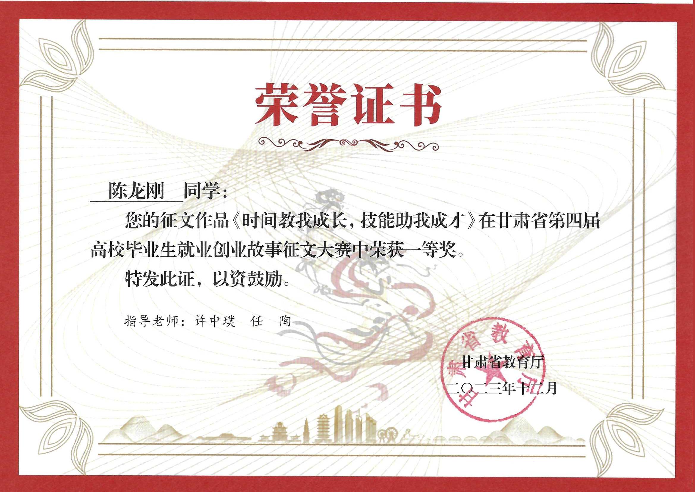 2023年學(xué)生在甘肅省第四屆高校畢業(yè)生就業(yè)創(chuàng)業(yè)故事征文大賽獲一等獎