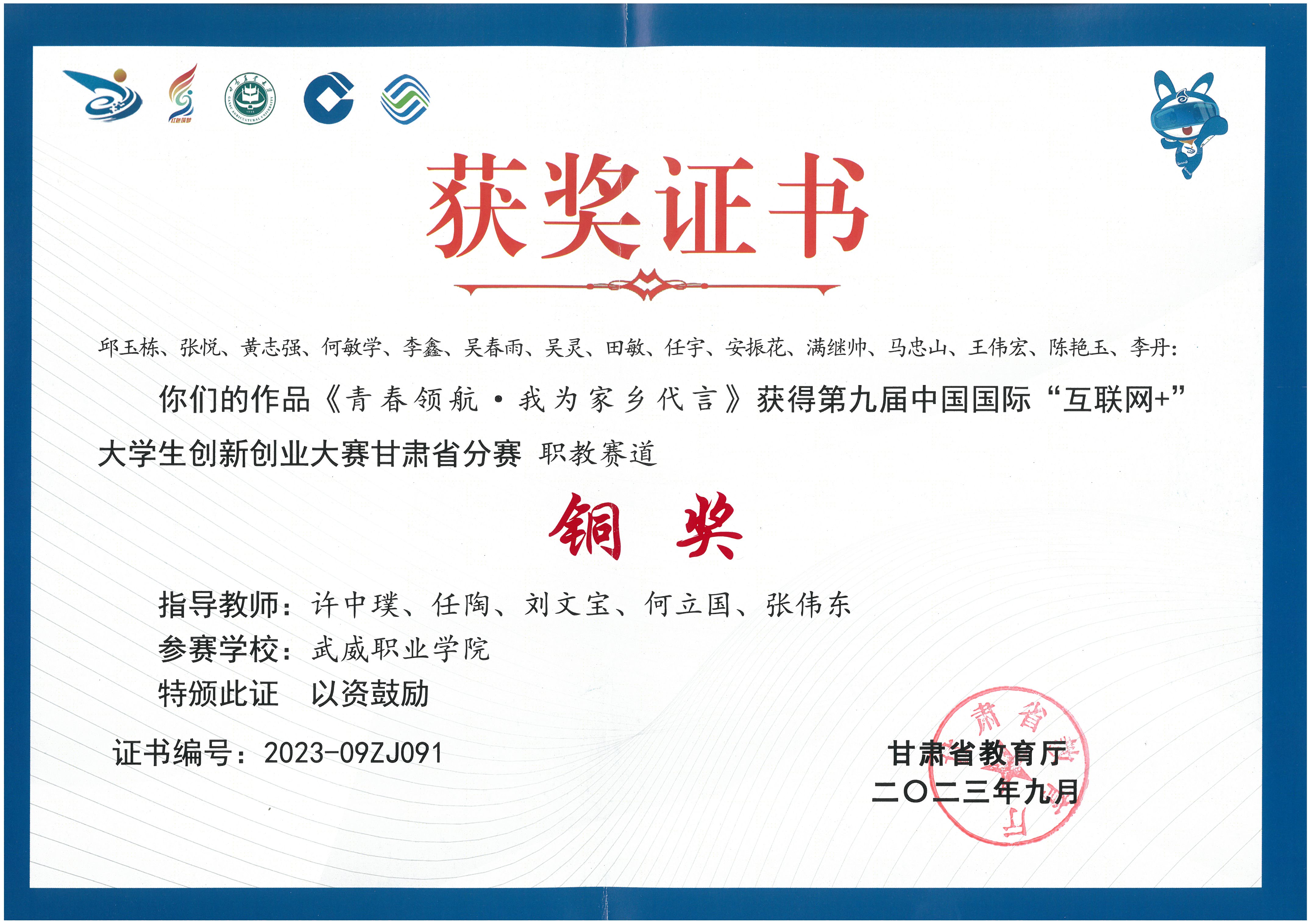 學(xué)生獲第九屆中國國際“互聯(lián)網(wǎng)+”大學(xué)生創(chuàng)新創(chuàng)業(yè)大賽甘肅賽區(qū)銅獎