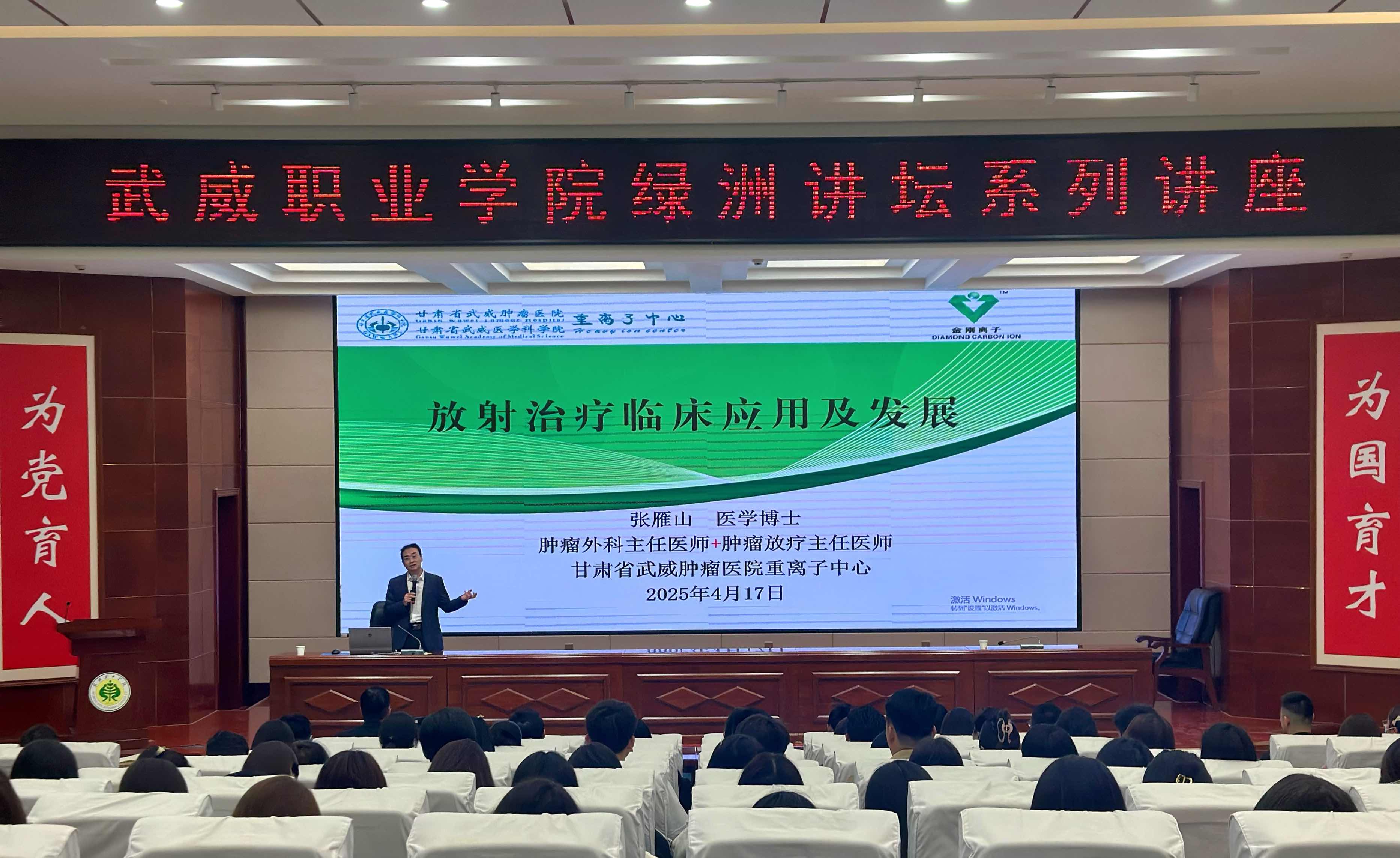 4月17日,學(xué)校特邀甘肅省武威腫瘤醫(yī)院副院長、重離子中心主任張雁山博士,在菁英廳作了“放射治療臨床應(yīng)用及發(fā)展”專題講座。學(xué)校黨委副書記翟存祥主持講座,醫(yī)學(xué)技術(shù)學(xué)院、藥學(xué)院、護(hù)理學(xué)院教師,2024級(jí)放射治療技術(shù)專業(yè)學(xué)生共210余人聆聽了講座。