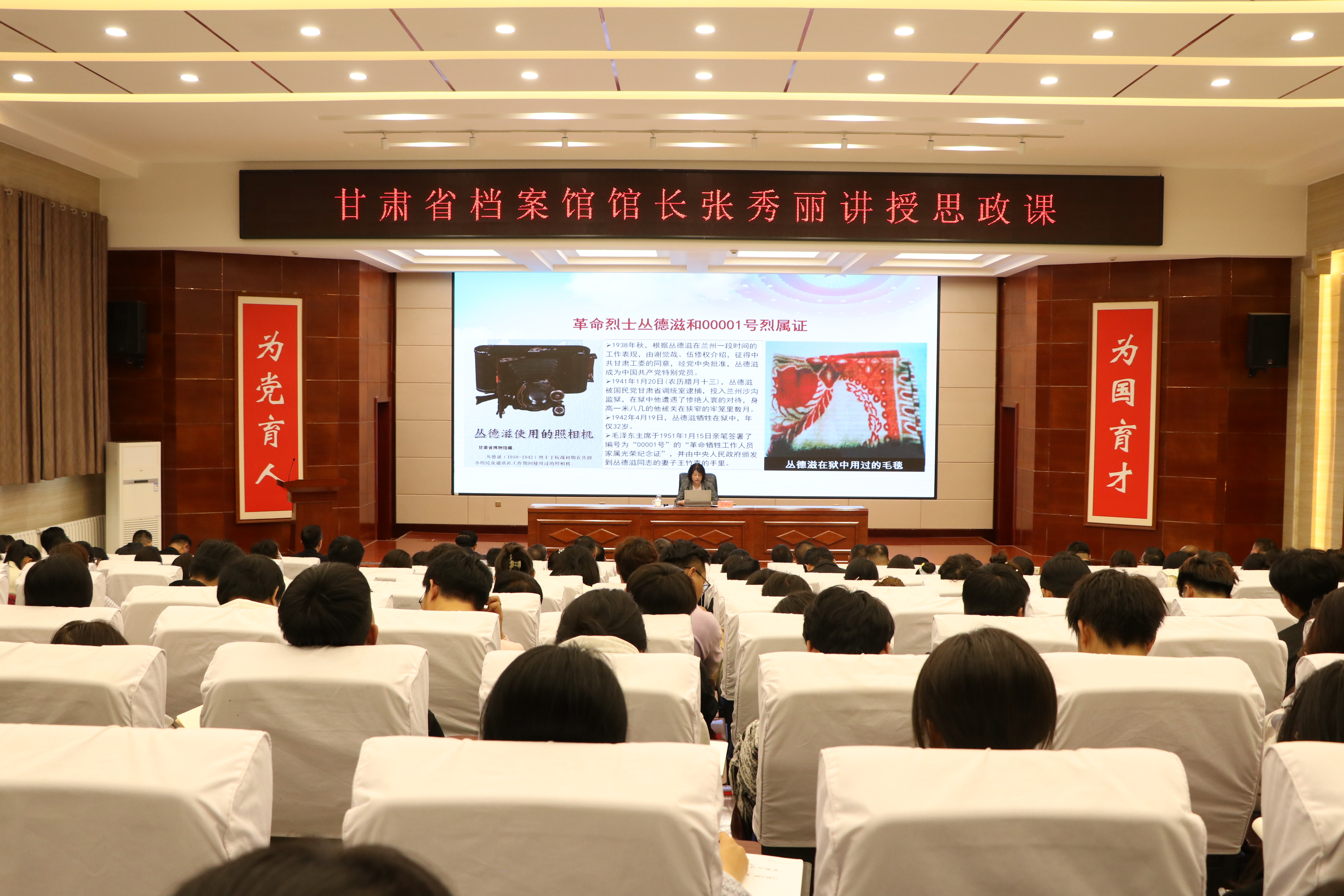 張秀麗結(jié)合自身從事檔案管理和文化研究的豐富經(jīng)驗(yàn),從檔案“存史、資政、育人”根本任務(wù)出發(fā),通過大量珍貴檔案文獻(xiàn)和歷史案例,系統(tǒng)闡述了檔案在記錄民族苦難輝煌、服務(wù)當(dāng)代治國理政、培育時(shí)代新人中的重要作用。報(bào)告中,她以館藏漢代簡牘、革命烈士叢德滋00001號烈屬證、民勤治沙檔案、甘肅地震檔案等一批具有歷史代表性和地域特色的檔案為載體,帶領(lǐng)師生穿越時(shí)空,感受中華民族生生不息的精神力量,深刻解讀“勿忘昨天的苦難輝煌,無愧今天的使命擔(dān)當(dāng),不負(fù)明天的偉大夢想”的時(shí)代內(nèi)涵。