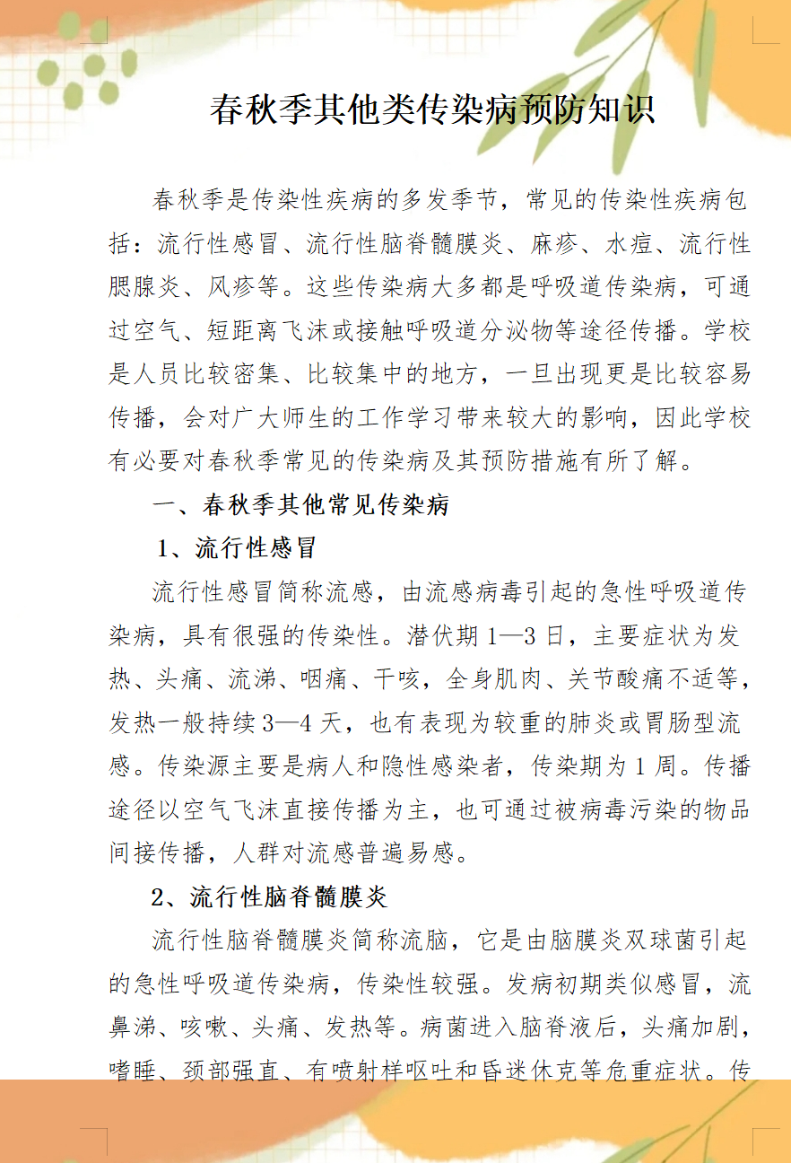 春秋季其他類傳染病預防知識