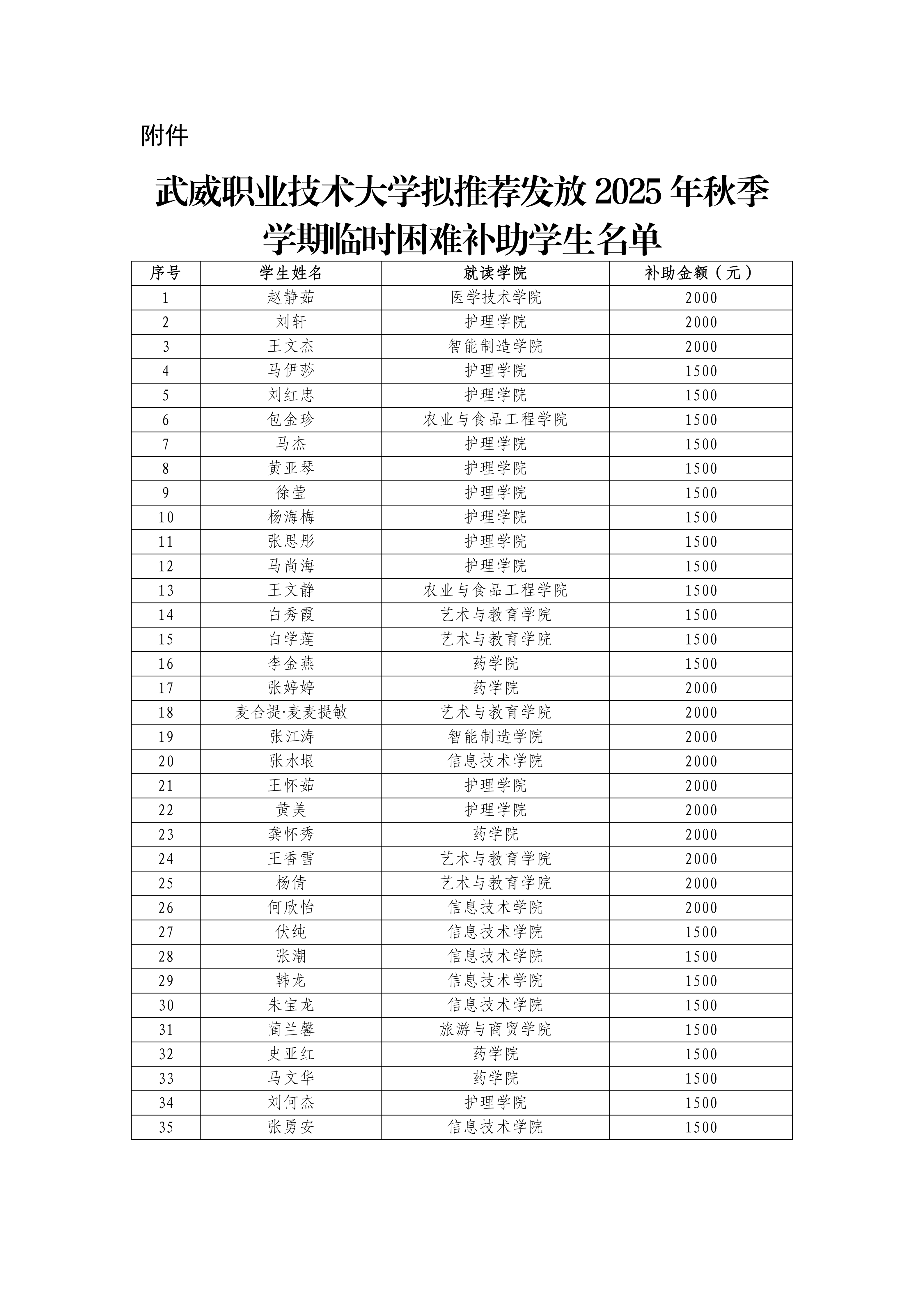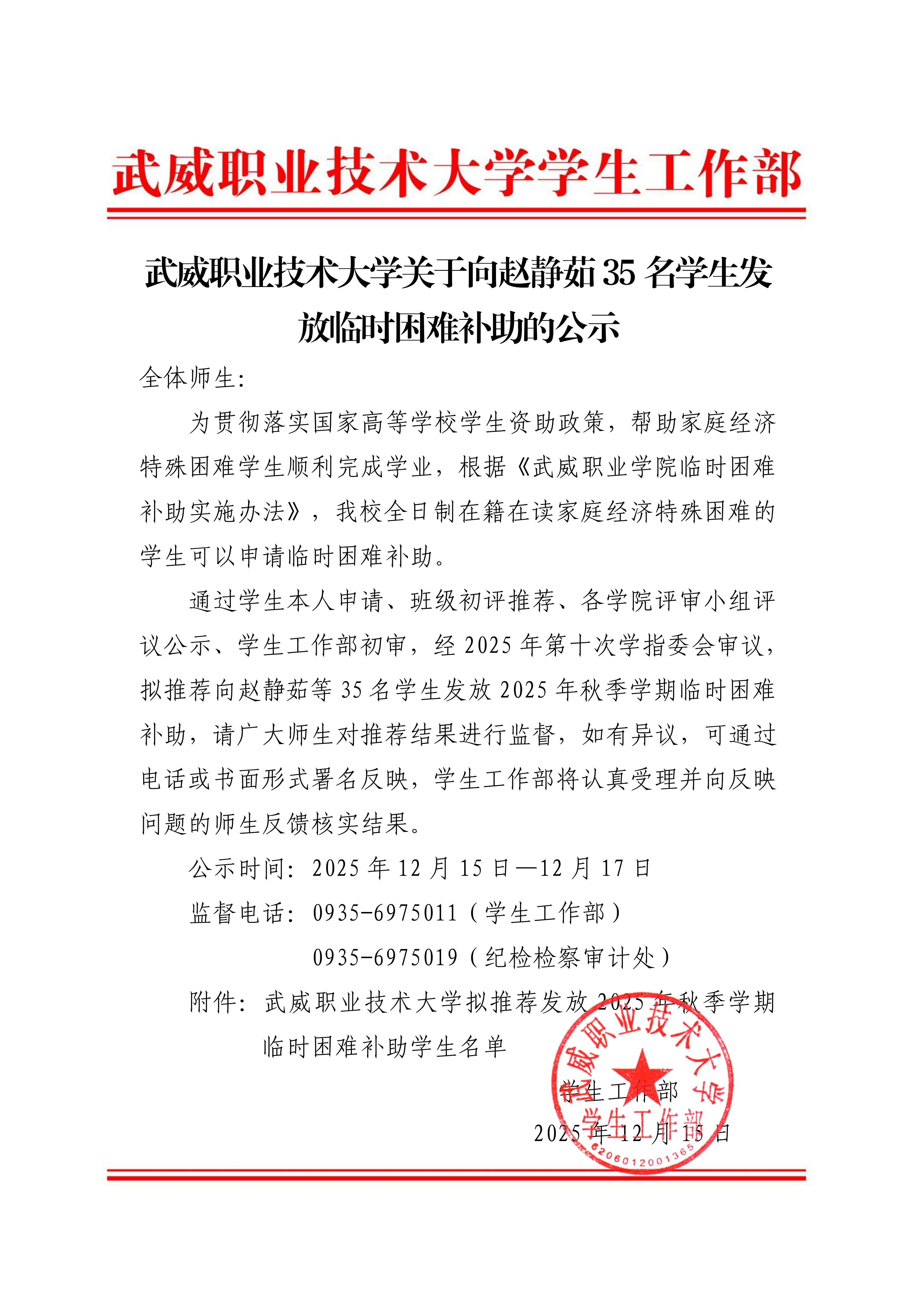 武威職業(yè)技術(shù)大學(xué)關(guān)于向趙靜茹35名學(xué)生發(fā)放臨時(shí)困難補(bǔ)助的公示