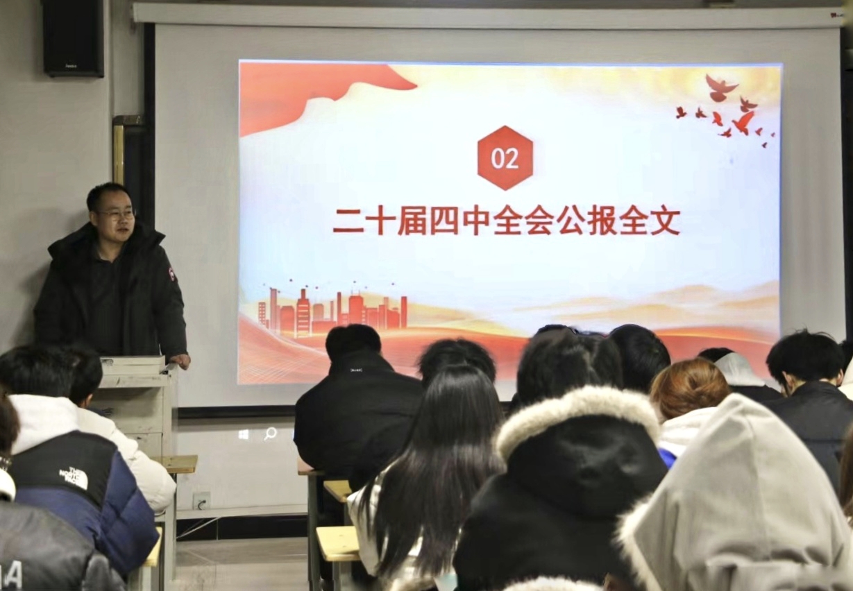 12月5日,學(xué)院黨總支書記黃述杰率先開展專題培訓(xùn),圍繞黨的二十屆四中全會(huì)召開的時(shí)代背景、重大意義和核心要義進(jìn)行系統(tǒng)解讀,全體黨員及入黨積極分子參會(huì)學(xué)習(xí)。黃述杰強(qiáng)調(diào),要持續(xù)深化黨的創(chuàng)新理論武裝,將學(xué)習(xí)貫徹黨的二十屆四中全會(huì)精神與學(xué)習(xí)貫徹習(xí)近平新時(shí)代中國(guó)特色社會(huì)主義思想緊密結(jié)合,切實(shí)把學(xué)習(xí)成果轉(zhuǎn)化為推動(dòng)工作的實(shí)際成效;要縱深推進(jìn)“四個(gè)突出”戰(zhàn)略發(fā)展思路,緊扣鑄牢中華民族共同體意識(shí)主線,錨定“十個(gè)較強(qiáng)”發(fā)展目標(biāo),推動(dòng)“鑄牢”工作全面融入專業(yè)建設(shè)、教書育人全過(guò)程各方面;要聚焦教育教學(xué)主責(zé)主業(yè),持續(xù)深化“大學(xué)風(fēng)”建設(shè)與課程思政改革,著力在抓落實(shí)、抓基層、抓學(xué)風(fēng)上實(shí)現(xiàn)新突破、取得新成效。