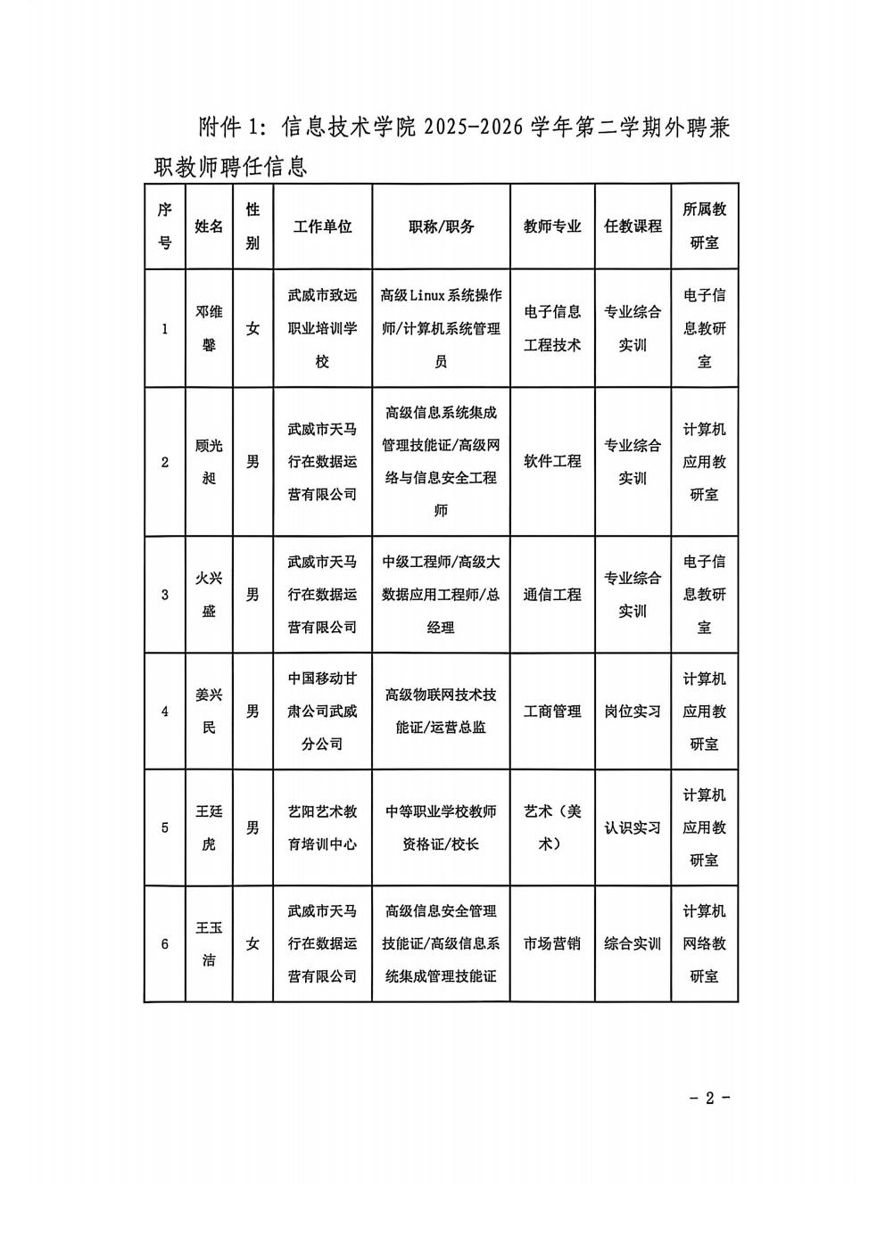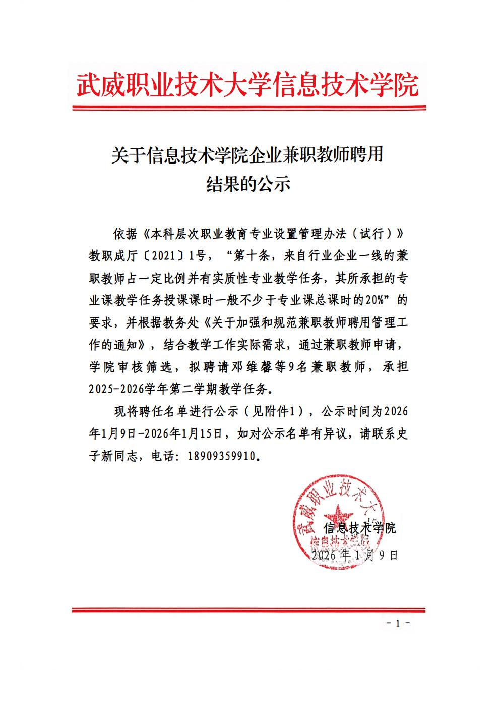 關于信息技術學院2025-2026學年第2學期企業(yè)兼職教師聘用結果的公示