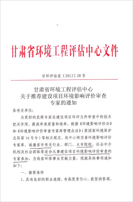 附件:甘肅省環(huán)境工程評(píng)估中心關(guān)于推薦建設(shè)項(xiàng)目環(huán)境影響評(píng)價(jià)審查專家的通知